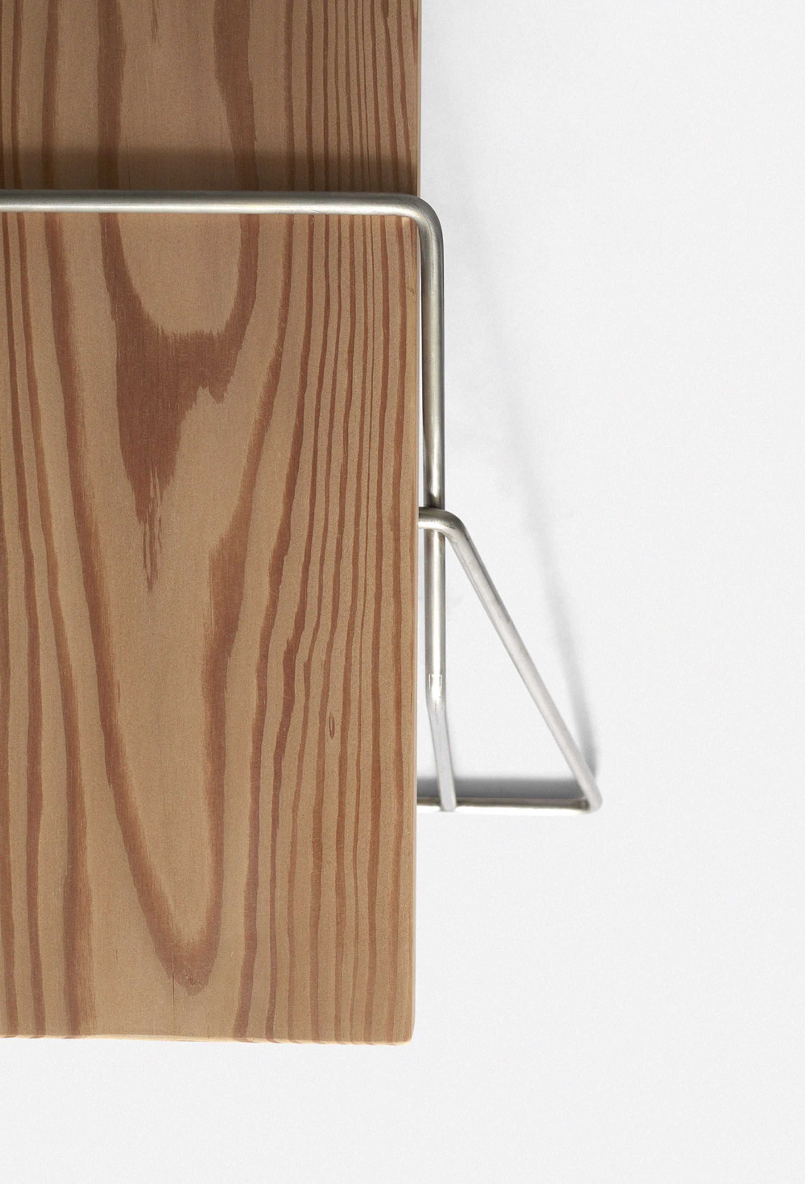 Lavice od Torbena Skova se vyznačuje jedinečnou konstrukcí, která se skládá pouze ze dvou částí. Dvě ocelové svorky s rustikálním vzhledem drží na prkně z douglasky bez použití šroubů nebo hřebíků. Dohromady má lavička industriální design provedený s ohledem na kvalitu a architekturu nábytku nejvyššího kalibru.