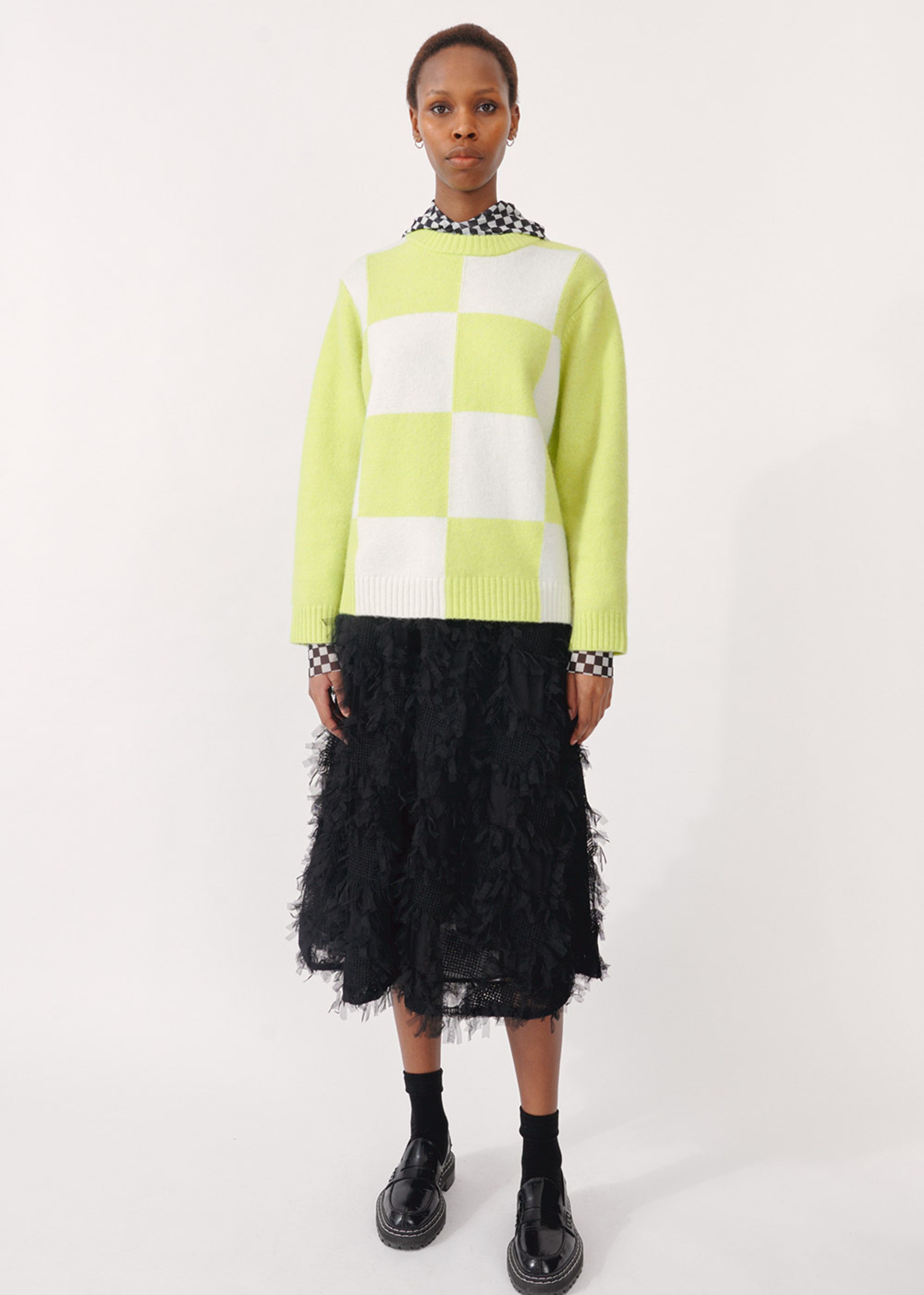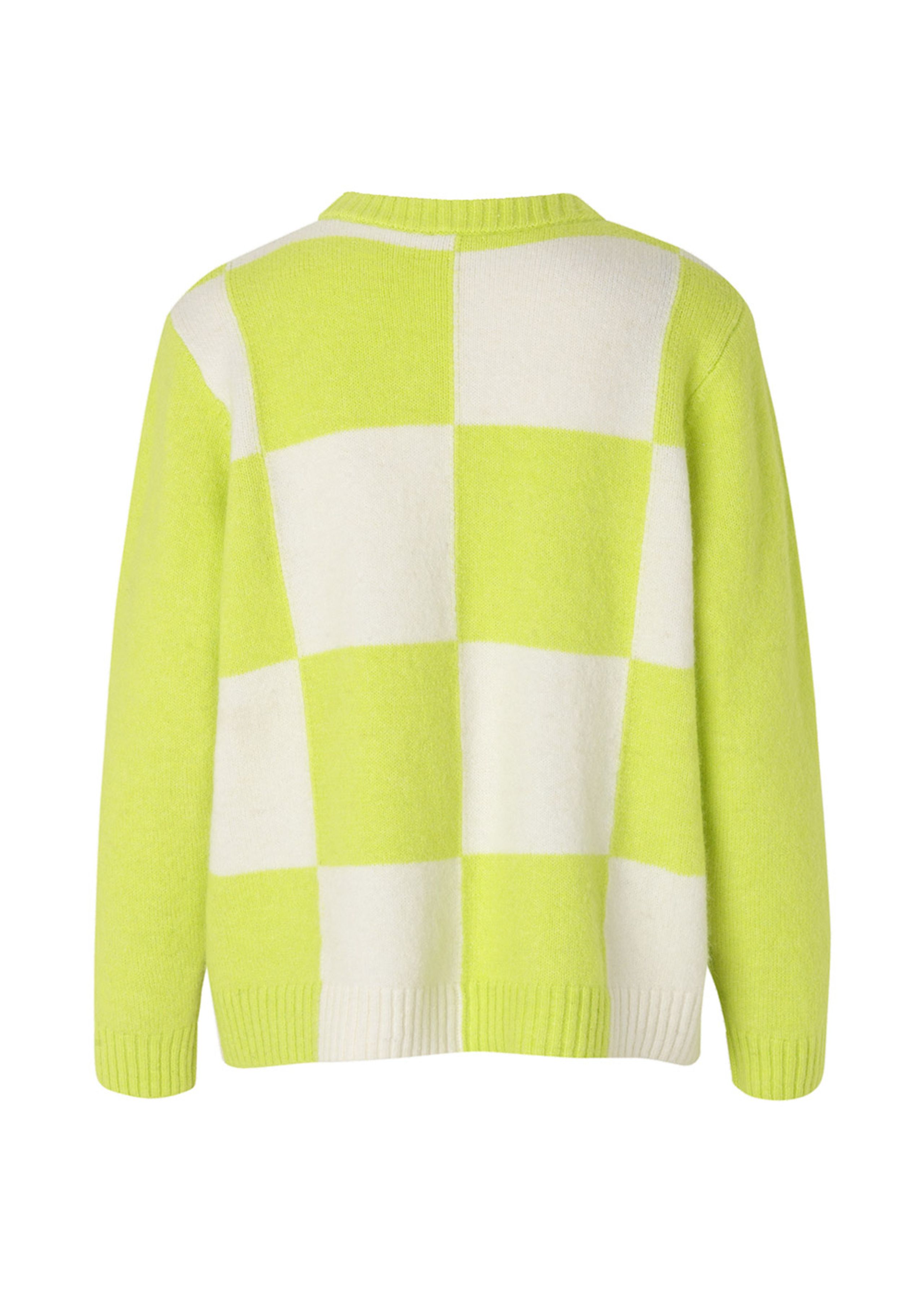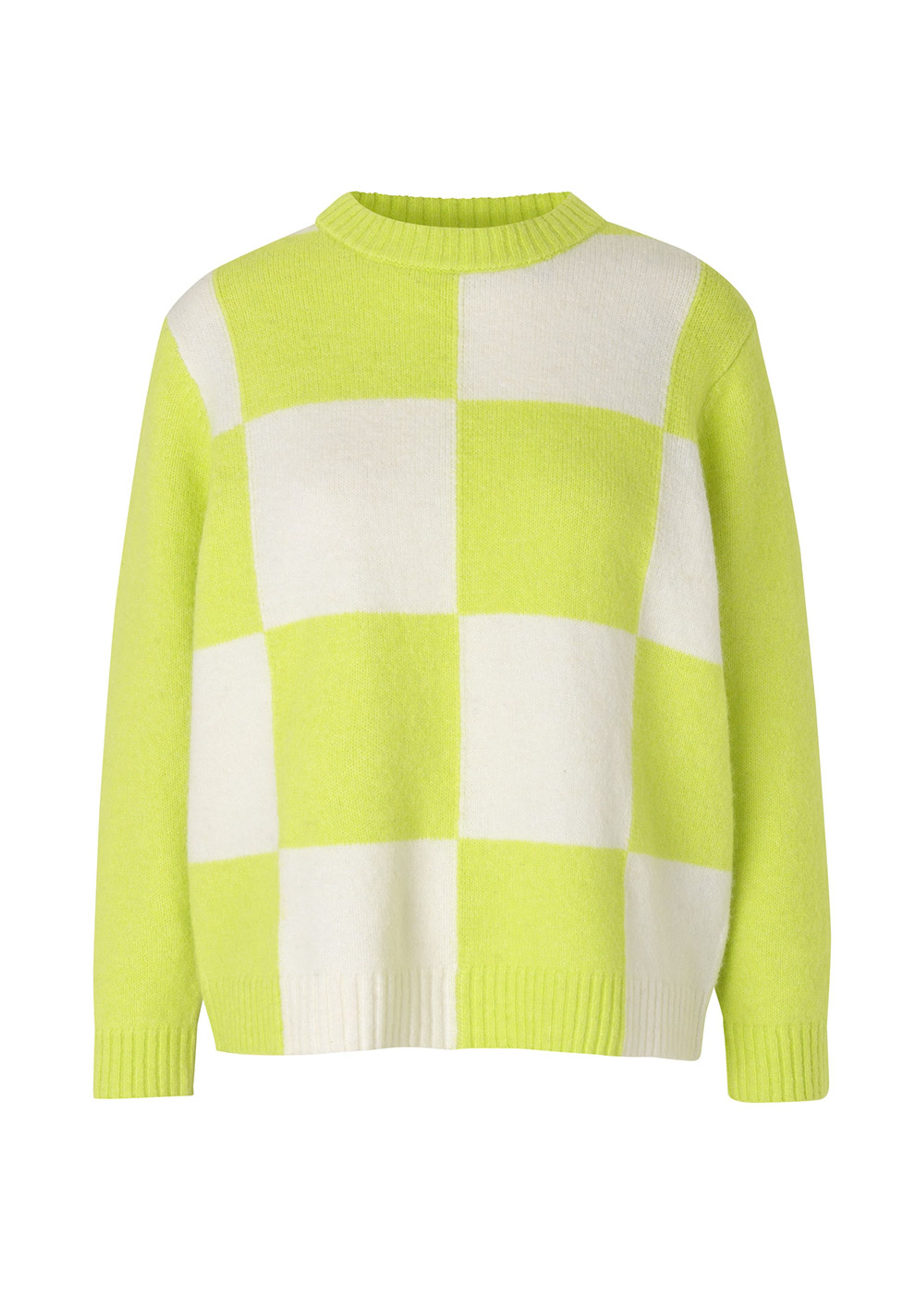 Finest knitwear from Baum und Pferdgarten. The blouse has a striking checked pattern in fresh lime green and white. The sweater has ribbing at the neck, hem and sleeves.