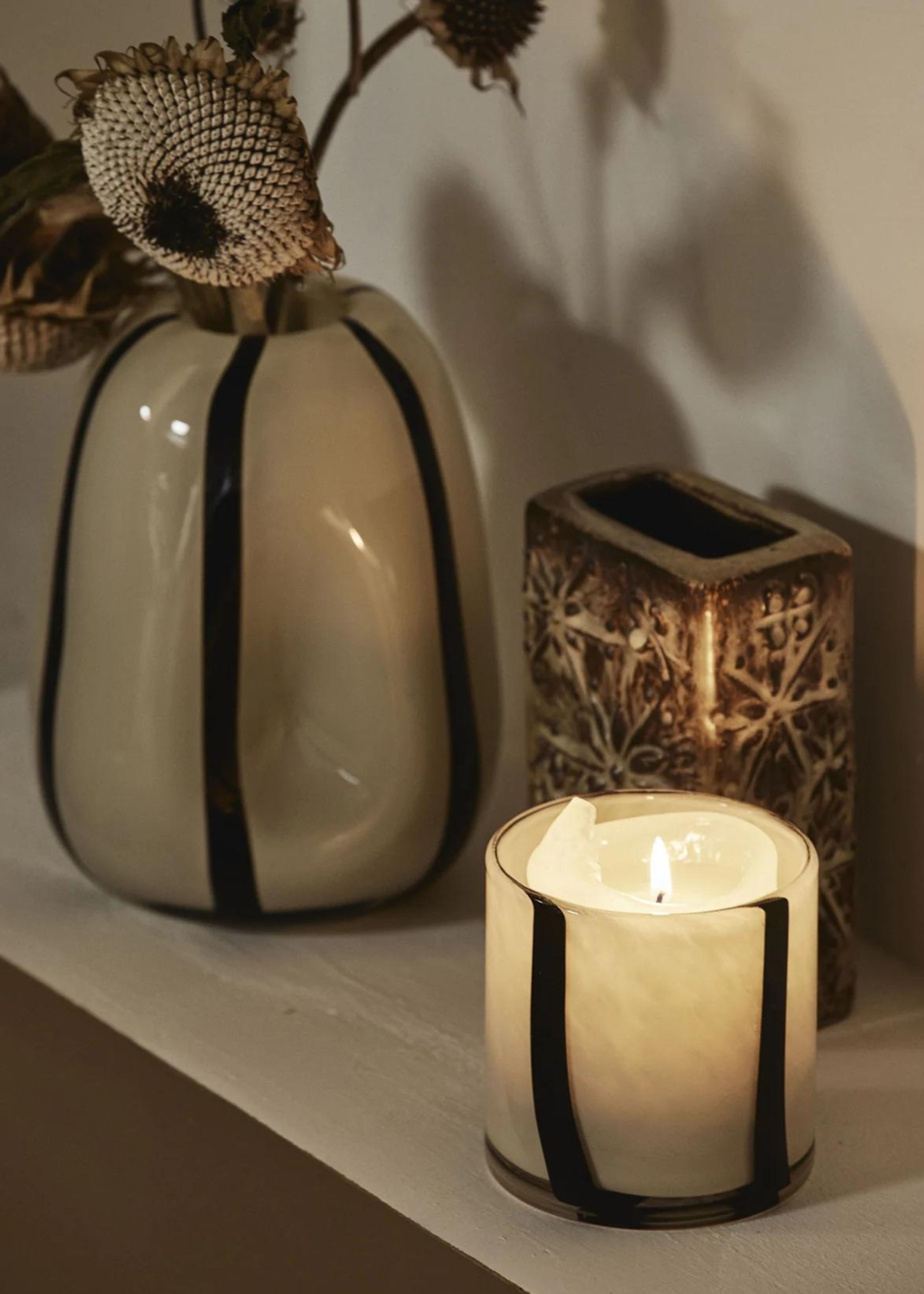 Edessa od společnosti Nordal je držák na čajovou svíčku, který vyzařuje klasickou eleganci a jemný šarm. Tento rafinovaný držák na čajovou svíčku, vyrobený s pečlivou přesností, je skutečnou poctou tradičnímu řemeslu. Jemná hra barev, která vzniká při zapálení čajové svíčky uvnitř, vytváří atmosféru tepla a útulnosti. Jemný pruhovaný design svícnu EDESSA zachycuje tanec světla způsobem, který promění každou místnost v místo klidu a krásy. Variace ve vzoru pruhů a tloušťce skla, které jsou výsledkem řemeslného procesu, dodávají každému držáku na čajovou svíčku jedinečný charakter.
