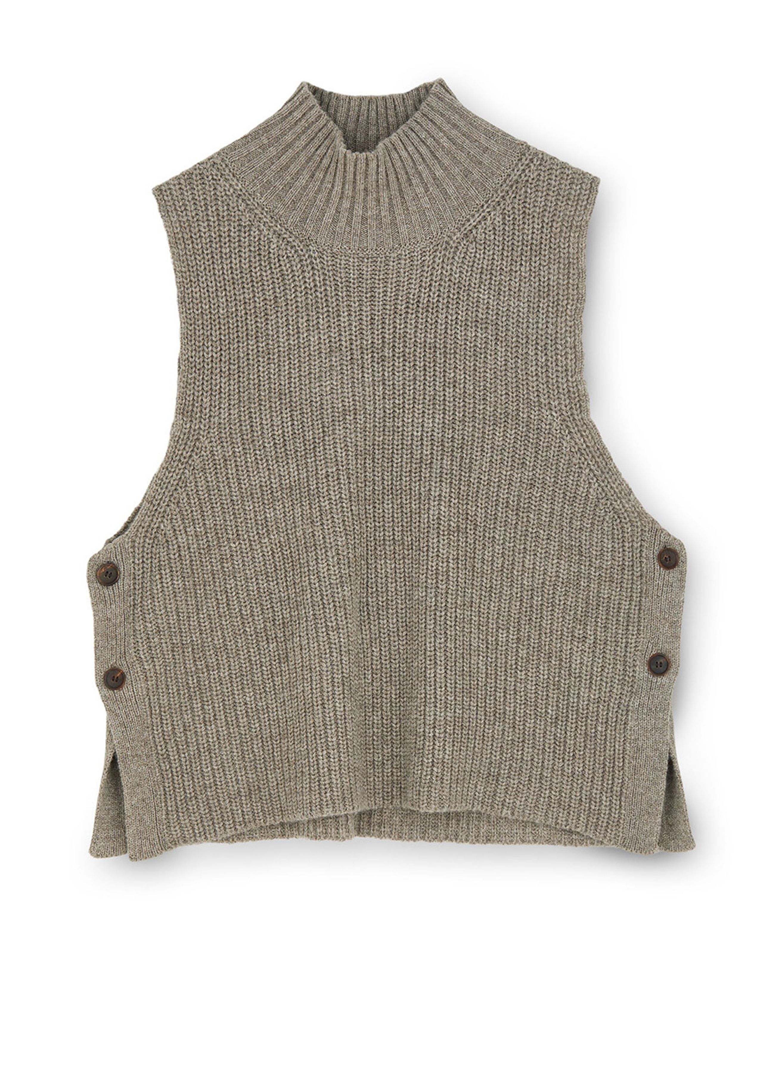 Fineste vest i klassisk ribstrik fra Aiayu. Strikken er lavet med en elegant høj krave og et behagelig, løst snit. lavet med høje slidser i siderne, som lukkes med smukke hornknapper.