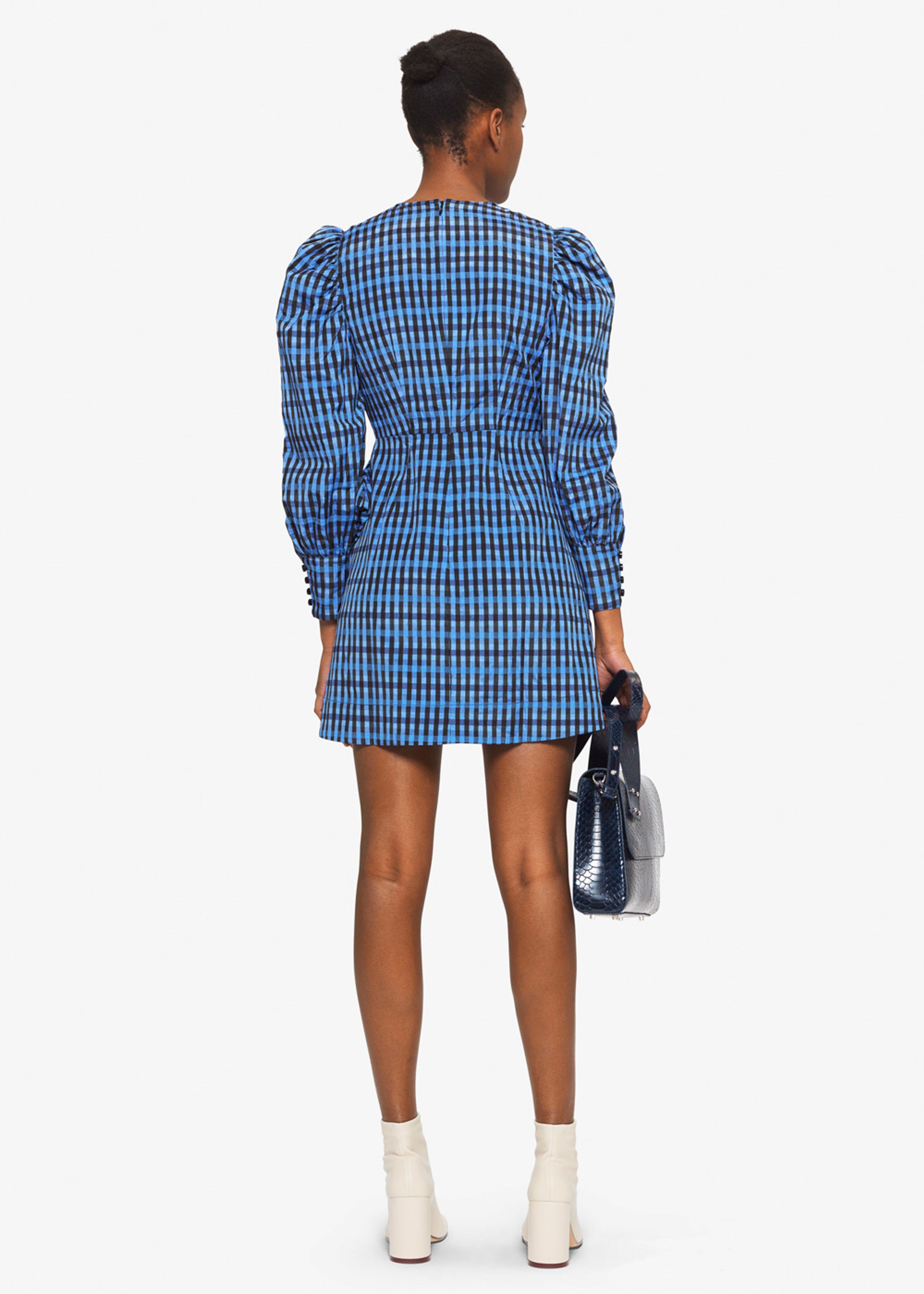 Smuk kort kjole fra Baum und Pferdgarten i fineste tern. Den har pufærmer, manchetter med fire knapper og skjult lynlås i ryggen. Den kommer i to farver.