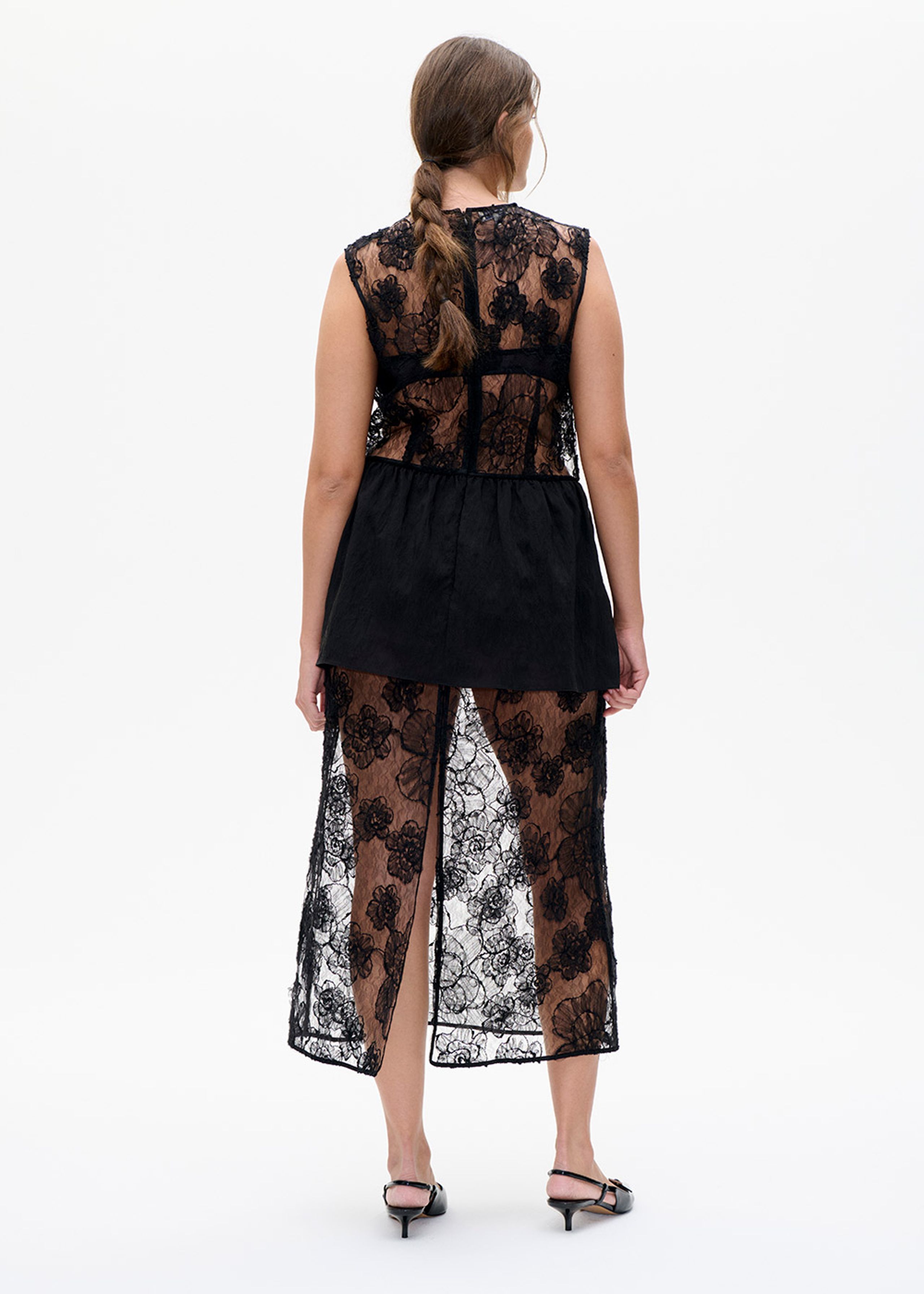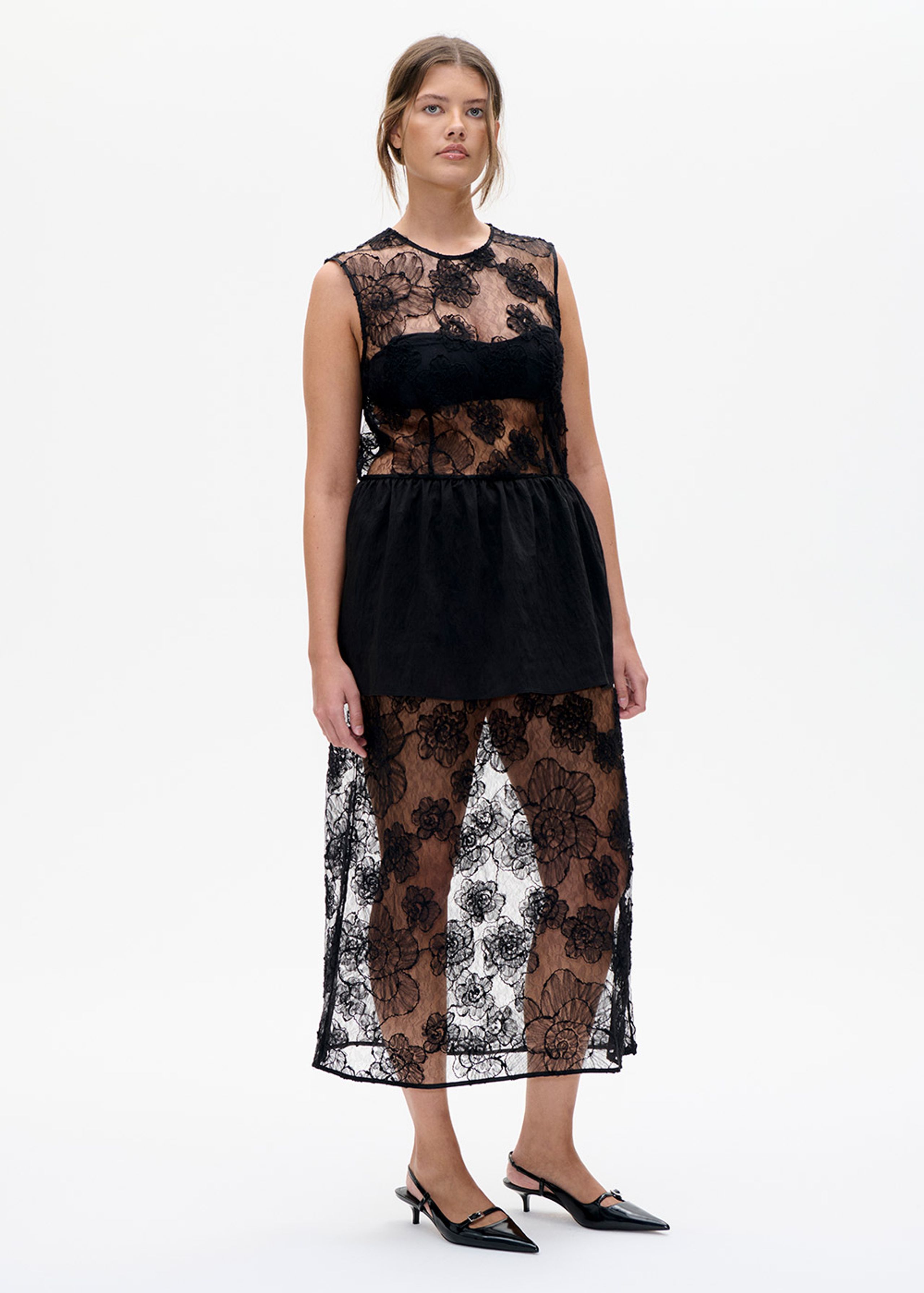 Antonie-kjolen fra Baum und Pferdgarten forener romantik og modernitet i et sofistikeret design. Den delikate blonde med blomsterbroderi skaber en elegant transparens, mens det strukturerede lag i taljen tilføjer et feminint og flatterende snit. Kjolen er produceret i 100% polyamid.