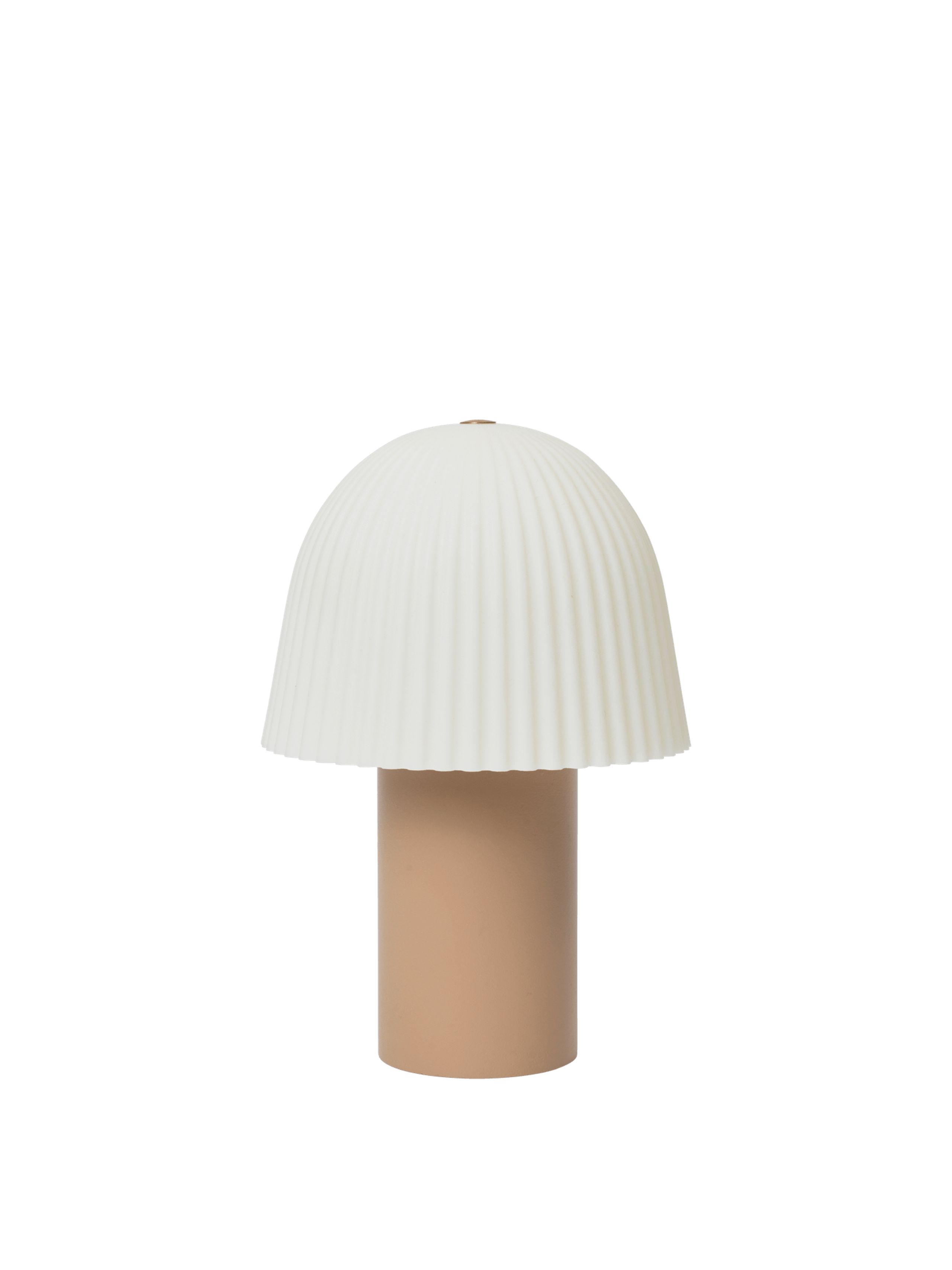 Frill Portable Lamp fra Ferm Living forener funktionalitet med et legende og elegant design. Den formstøbte skærm har en subtil riflet overflade, der tilfører dybde og en sanselig taktilitet, mens den solide base sikrer stabilitet. Det bløde, omgivende lys skaber en varm atmosfære, ideel til hyggelige stunder på børneværelset.