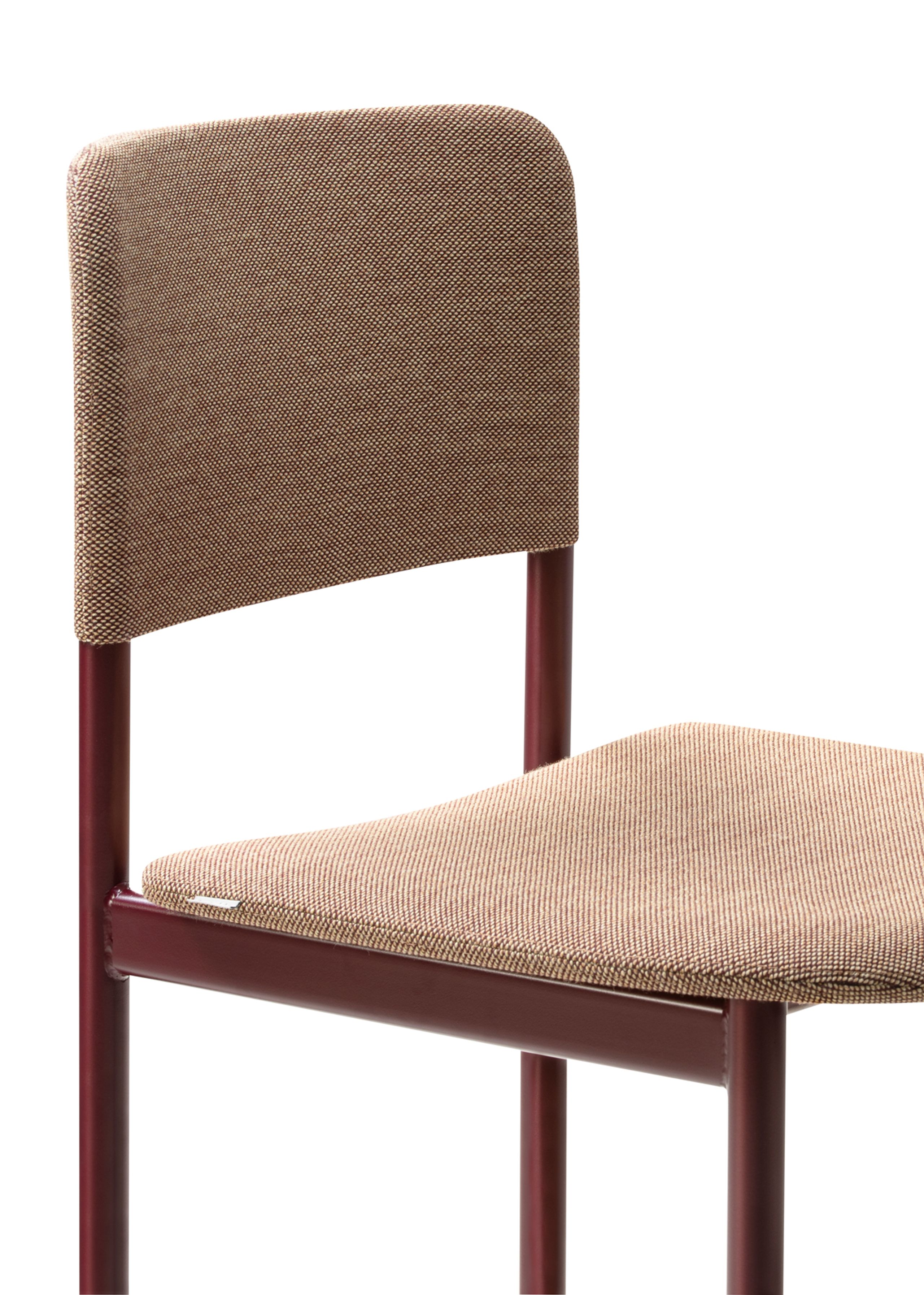 - Materiale: Stel i pulverlakeret stål eller børstet krom med ryglæn og sædekerne i lakeret FSC-certificeret finér, polstret med HR skum og tekstil/læder. Leveres som standard med dupsko i plast, hvoraf dupsko i filt kan tilkøbet.