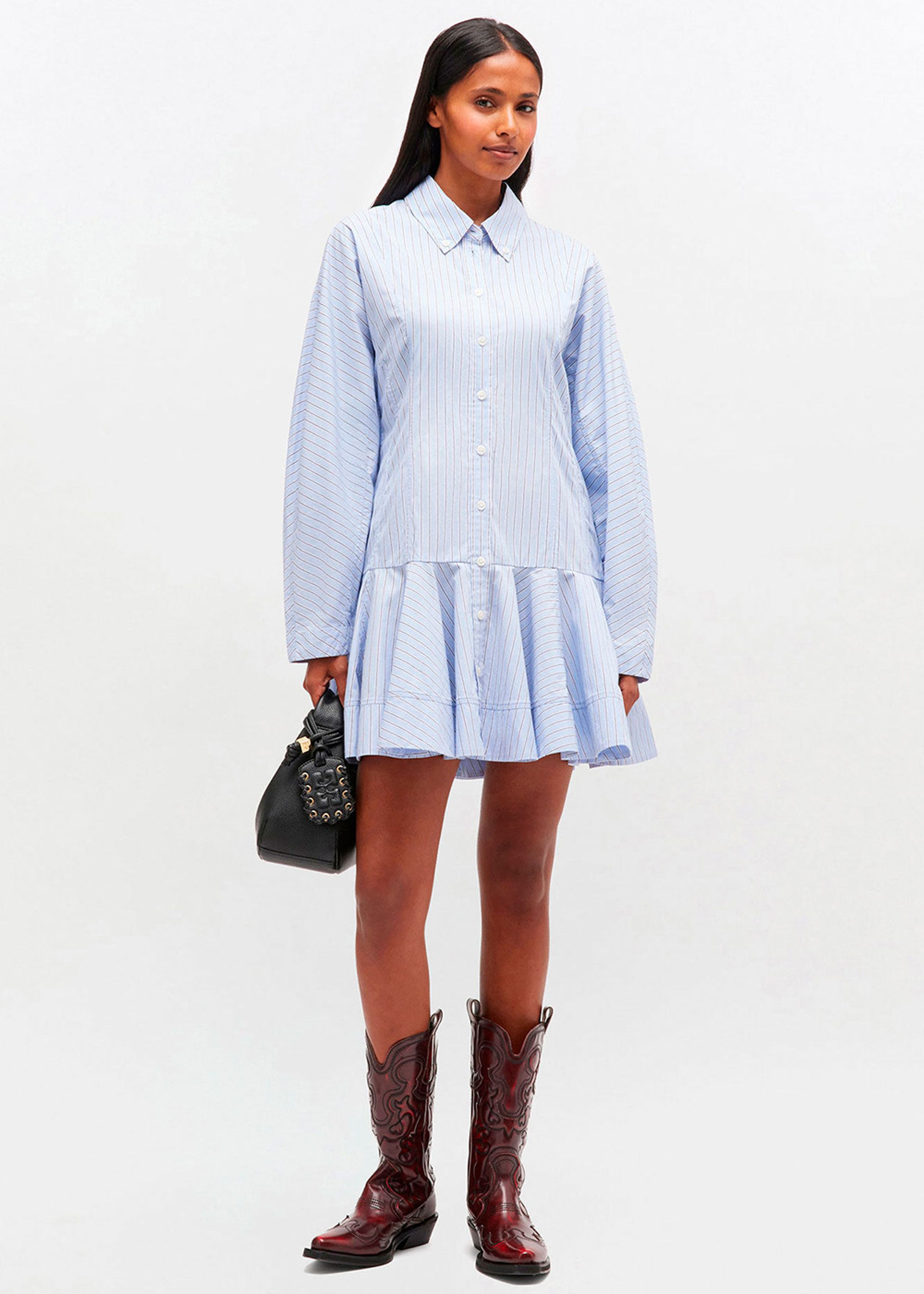 Stripe Cotton Buttoned Mini Dress fra Ganni forener klassisk skjortekrave og knaplukning med en moderne, feminin silhuet. Den er fremstillet i blød, ansvarligt fremstillet bomuld med en smal, lodret stribestruktur i blå og hvide nuancer, der tilføjer et elegant og friskt udtryk. Det figursyede snit i taljen og den let klokkeformede underdel skaber et flatterende fald og en sofistikeret balance mellem struktur og bevægelse.