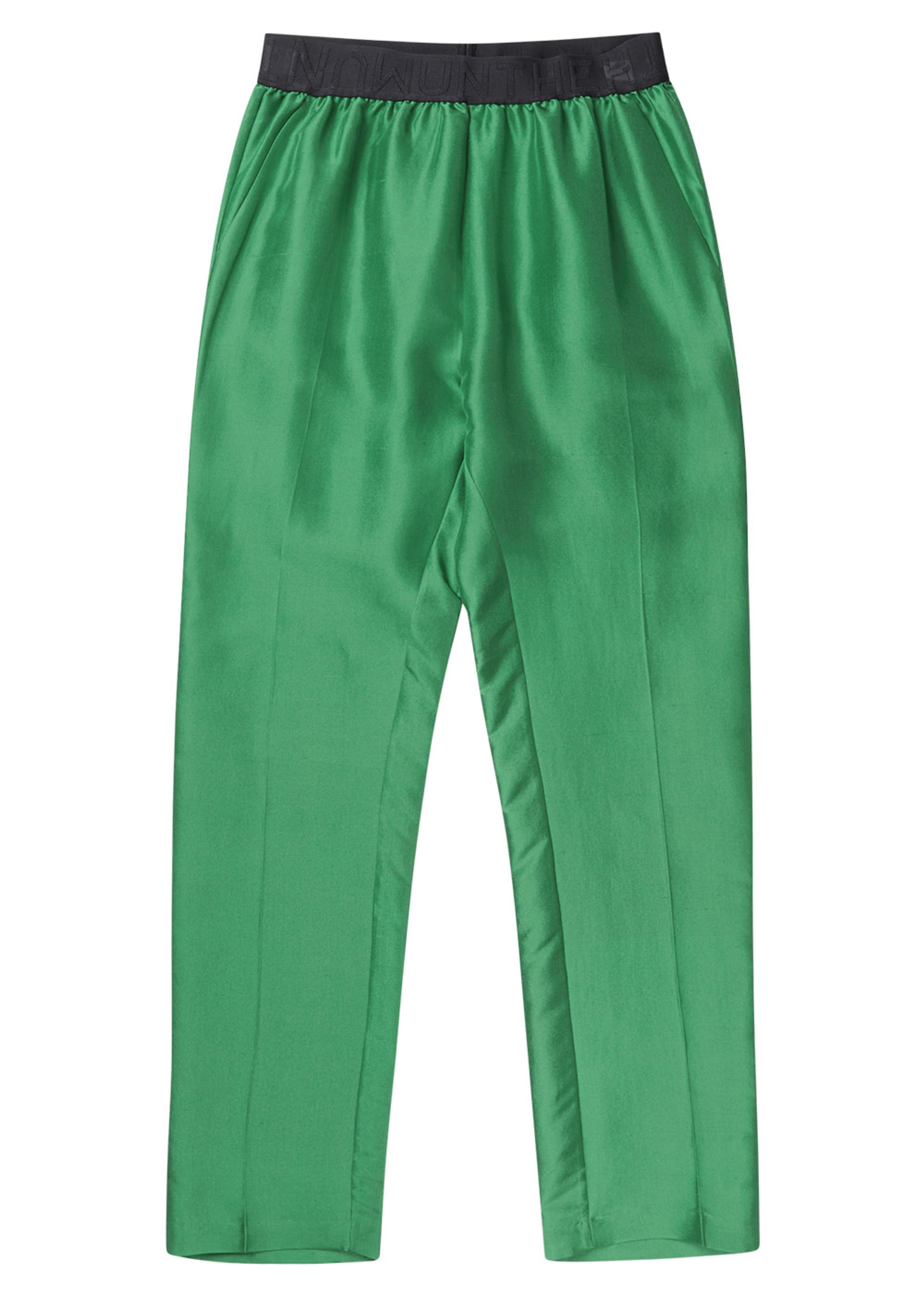 Trendy bukser fra MUNTHE i en moderne grøn farve. Modellen har en klassisk løs pasform, med smukke pressefolder samt et elastisk i livet med MUNTHEs logo. Buksen er udført i en luksuriøs silke kvalitet, der både kan kombineres med en blazer og hæle eller et par sneaks og en sweatshirt.