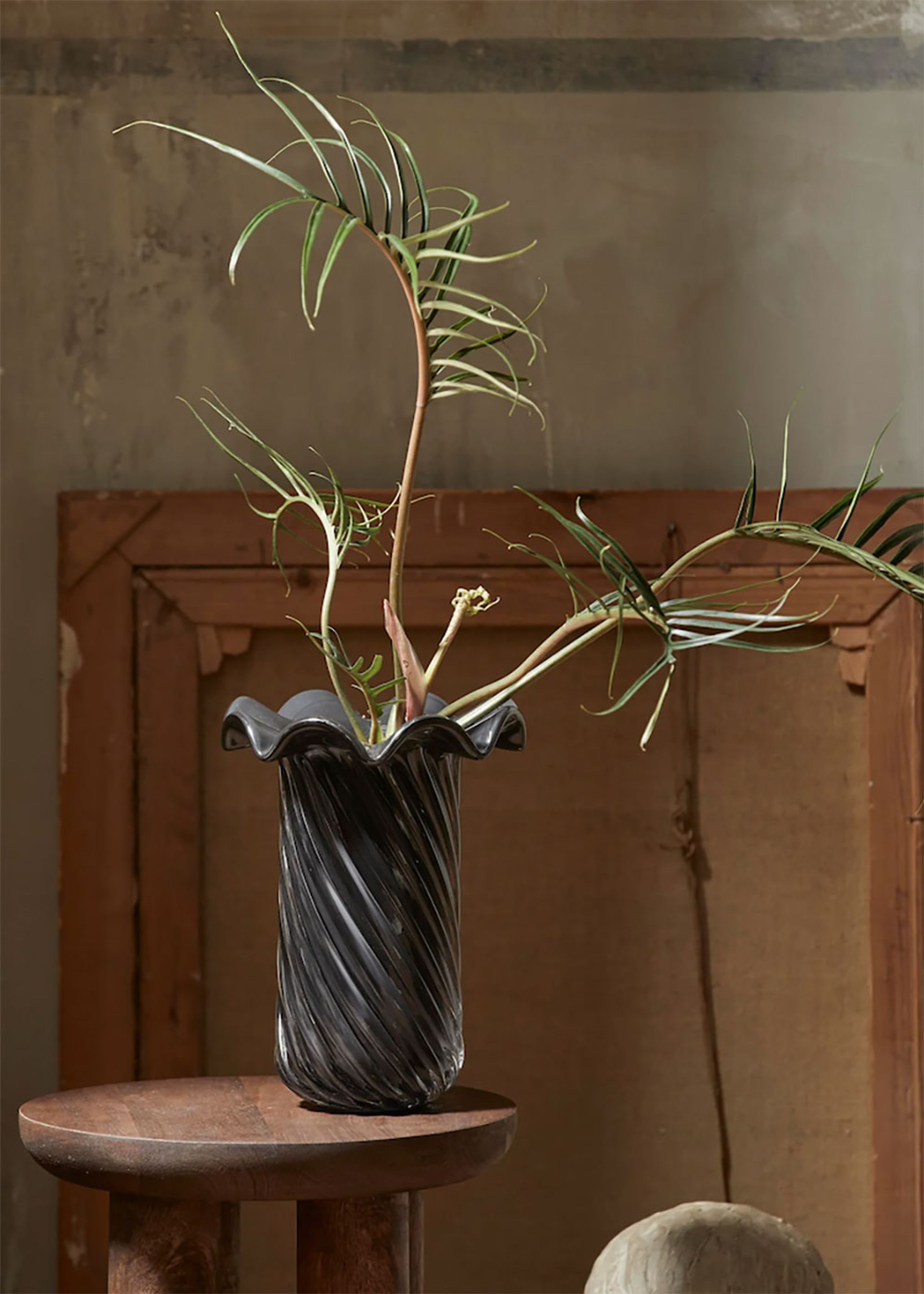 Koro Vase fra Nordal er en moderne og tidløs skønhed. Med sin cylindriske form og et elegant tvist skaber den rammen for en luksuriøs og elegant vase. Den bølgede kant tilføjer kontrast til den ellers klassiske udformning og gør den til et skulpturelt element, der passer perfekt både med og uden blomster.