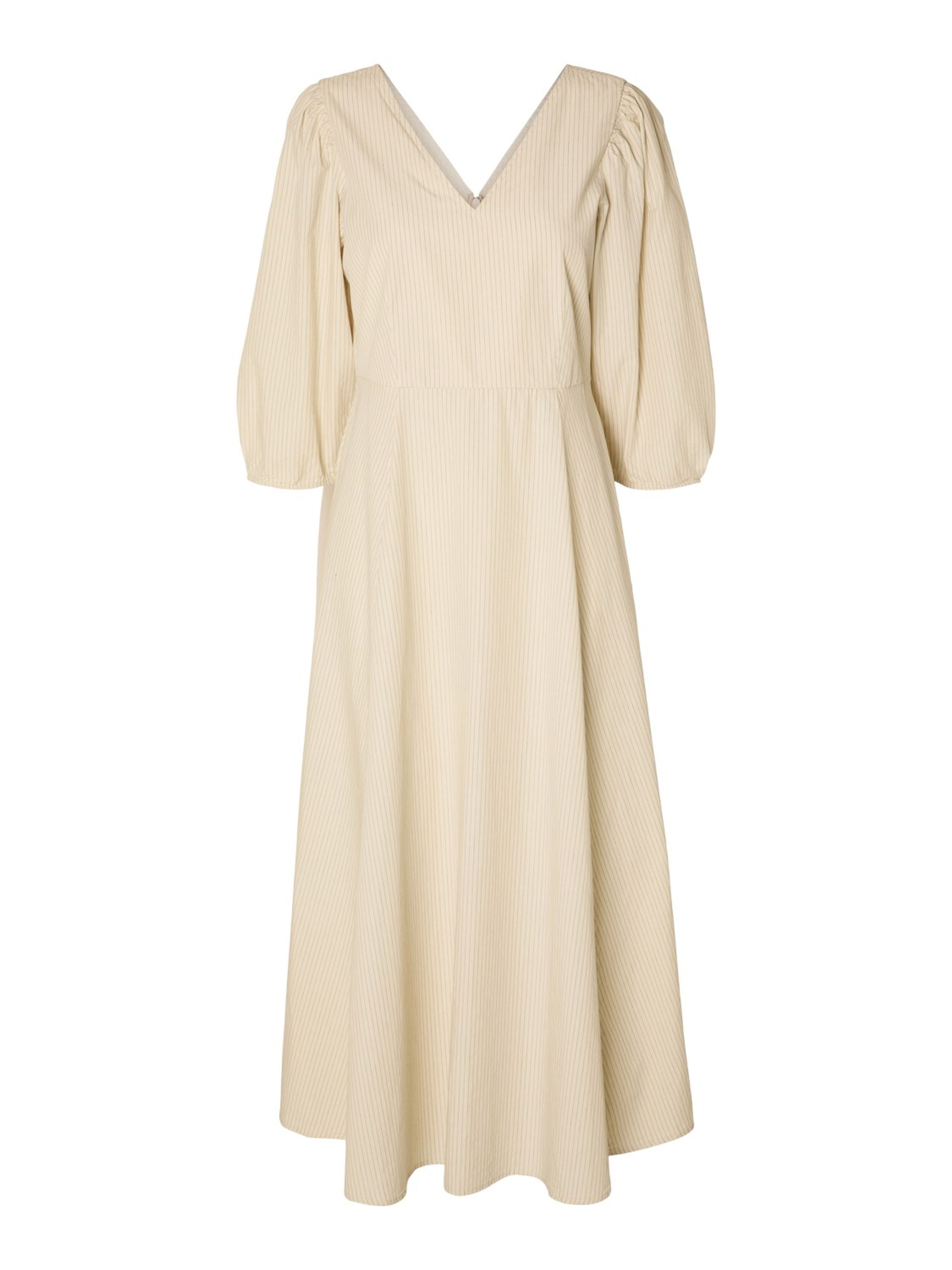 Elegant kjole i en crispy bomuldskvalitet fra Selected Femme. Modellen er med 3/4 længde ærme, har V-udskæring og et let indsnit i taljen, for at give lidt facon.