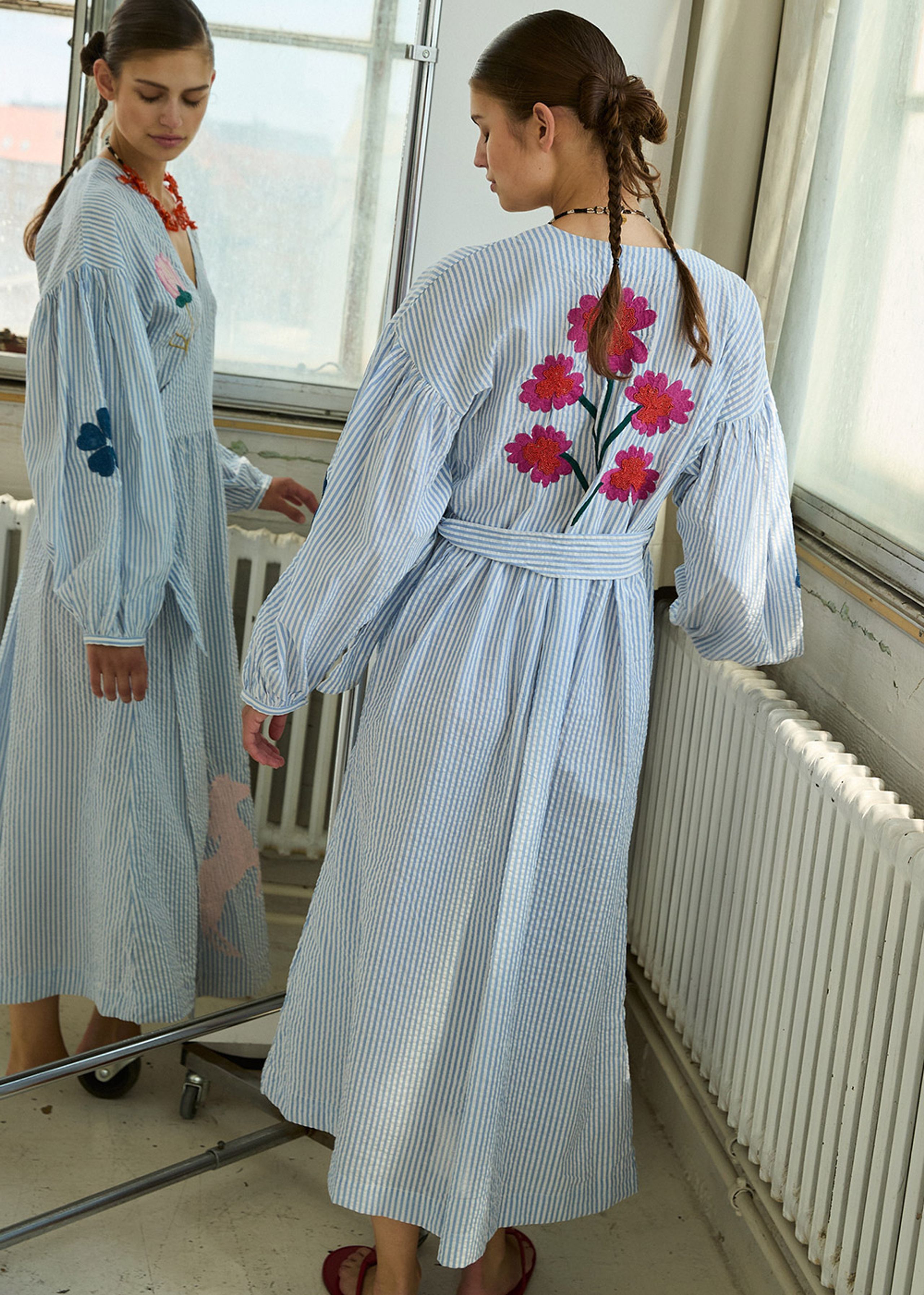 Caro Dress fra Sissel Edelbo kombinerer ansvarlig design med tidløs elegance. Denne smukt konstruerede kjole er fremstillet af restbomuld, hvilket giver den et unikt og raffineret udtryk. Den lette og luftige silhuet gør den ideel til både hverdag og fest, samtidig med at den tilbyder en behagelig pasform, der fremhæver kroppens naturlige linjer.