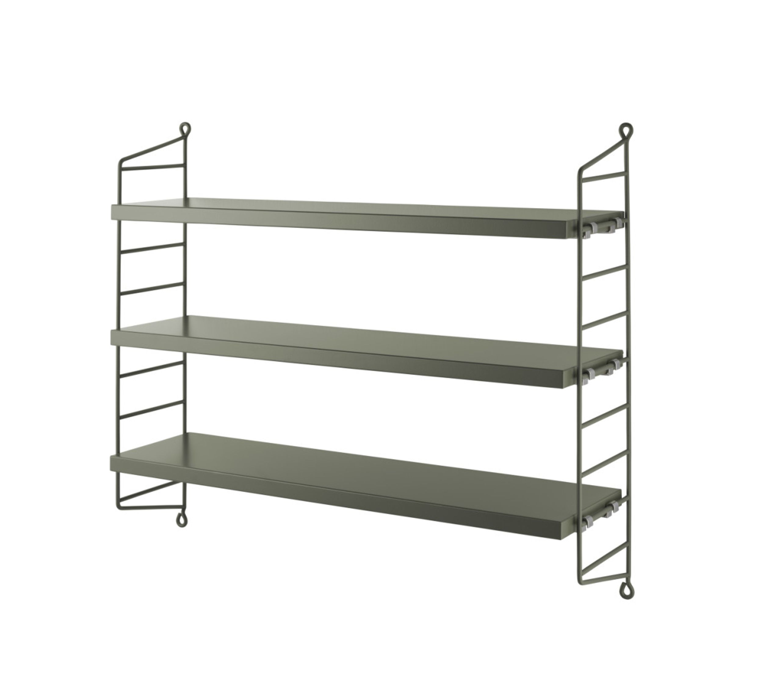 Reolen er designet til at fungere både som en praktisk og æstetisk tilføjelse til dit hjem. String Pocket er ideel som natbord eller ekstra opbevaringsflade i entreen og kan nemt tilpasses forskellige rum og behov. De perforerede metalhylder med en lav kant på 2 cm understøtter tilføjelsen af kroge og stænger for øget opbevaringskapacitet, hvilket gør det muligt at skabe en skræddersyet løsning. Dette fleksible system inviterer til kreativitet og giver plads til at udtrykke personlighed gennem indretning, hvor det både kan stå alene eller integreres med andre møbler for et sammenhængende look.
