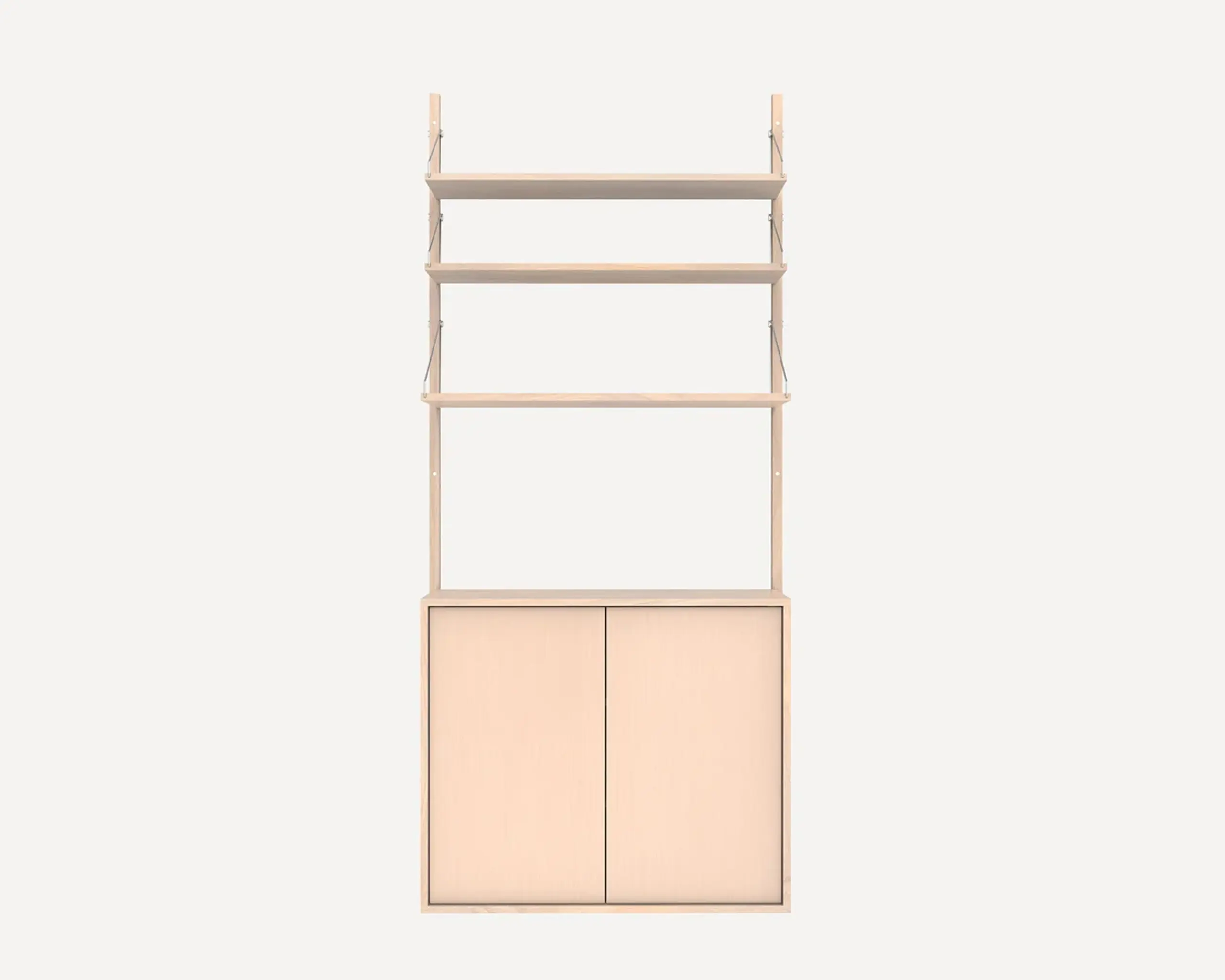 Der Regal-Bibliotheksschrank ist eine natürliche Weiterentwicklung der anpassungsfähigen Frama Regal-Bibliotheks-Serie und passt perfekt in die Regal-Bibliotheks-Einrichtung. Sein Design ermöglicht verschiedene Stylingoptionen mit langlebigen Stahlschrauben auf Eichenholzschienen.