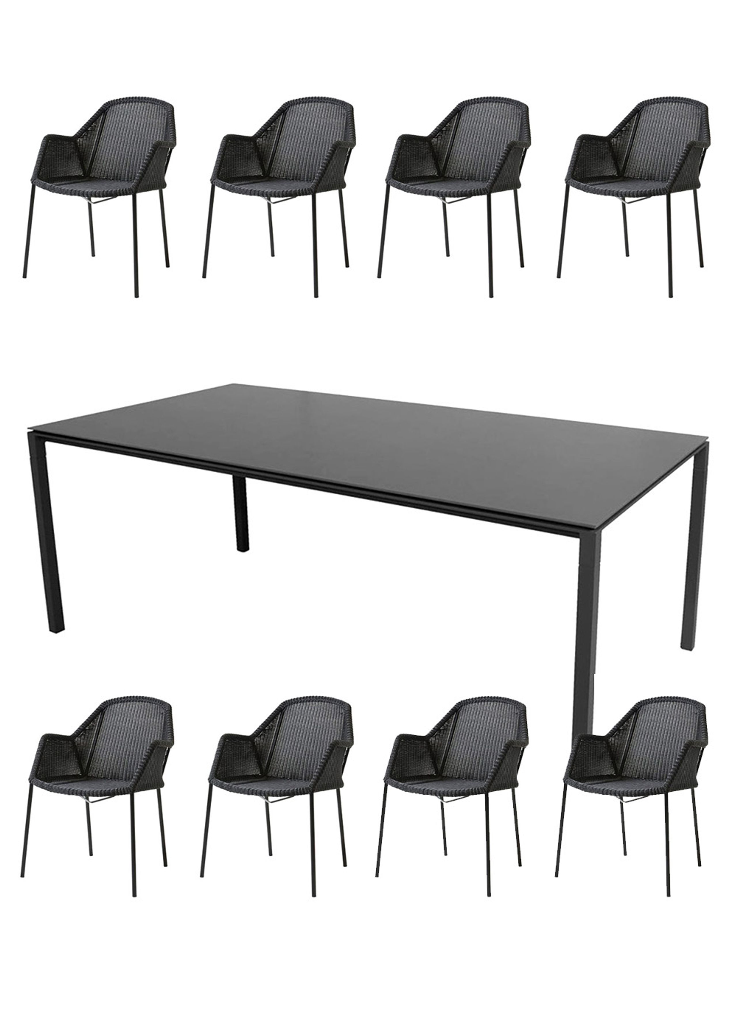 HINWEIS: Dieses Set enthält 8 Stühle Breeze (B: 60 X T: 62 X H: 83 X SH: 45 CM) und 1 Tisch Pure mit niedrigem grauem Gestell und schwarzer Keramikplatte (B: 280 X T: 100 X H: 73 CM)