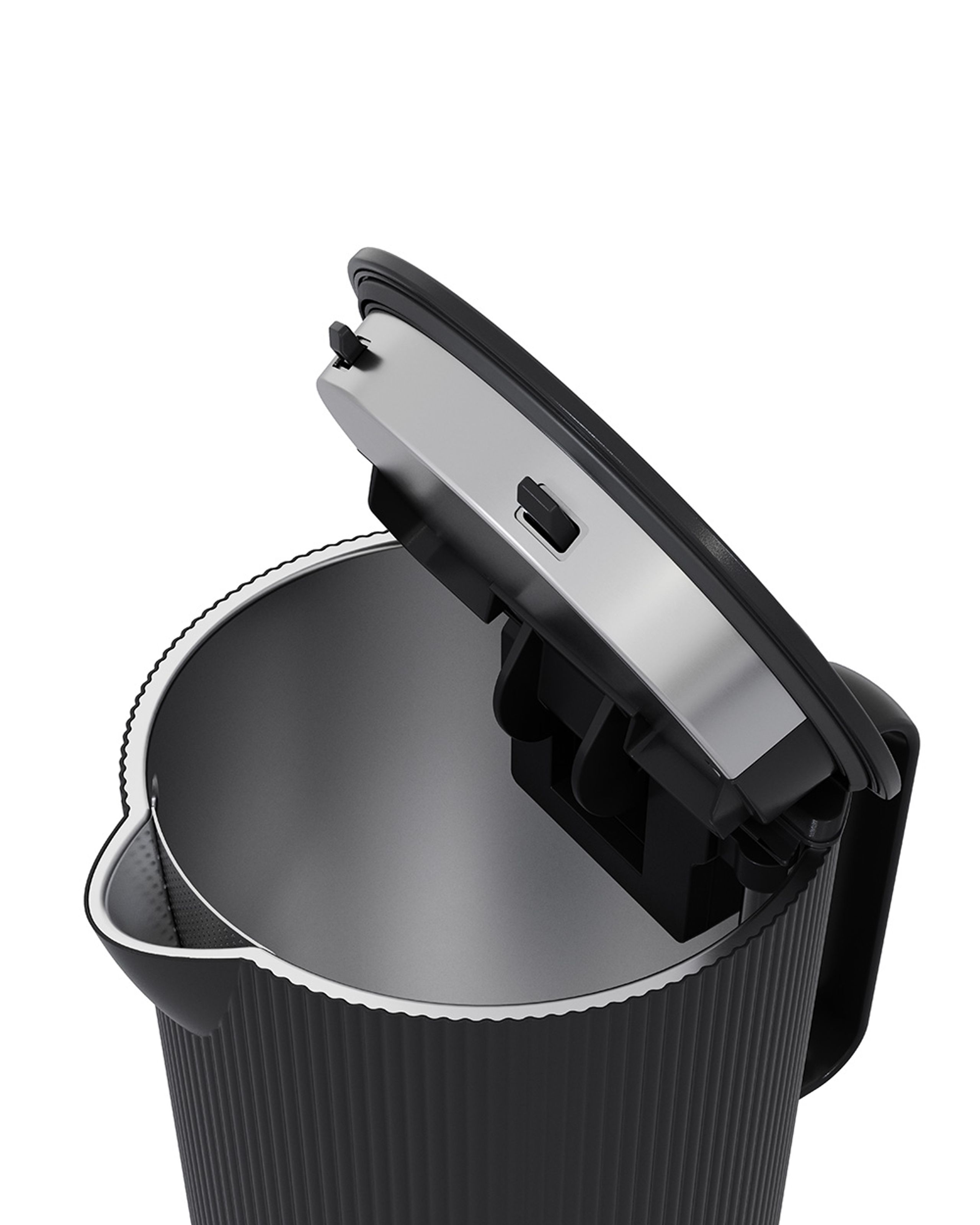 The Bernadotte Electric Kettle from Georg Jensen is an elegant interpretation of classic Scandinavian design, created in stainless steel with a sophisticated black finish. Inspired by Sigvard Bernadotte's iconic fluted patterns, this kettle combines style with functionality. It holds 1.5 liters and is designed with double walls to keep water hot for longer. The separate base and soft opening lid make it highly practical for everyday use, while the removable limescale filter and LED indicator ensure easy maintenance. Thanks to the 360° base and adjustable cord length, it fits easily into any kitchen layout.