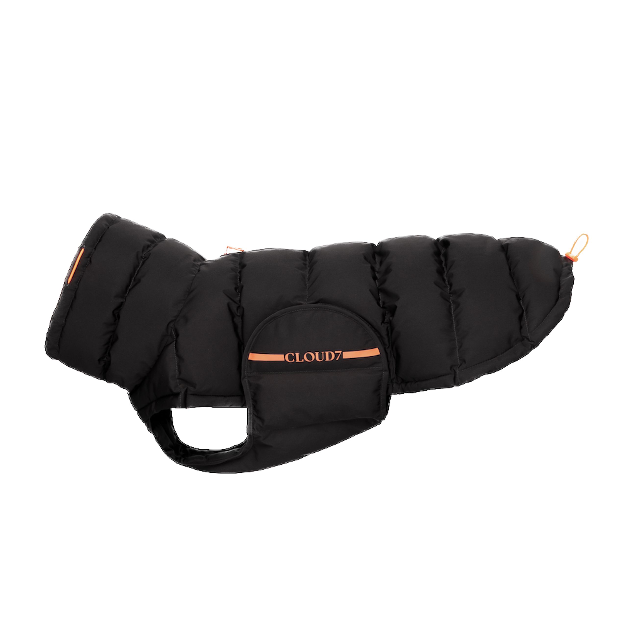The dog coat is filled with Eco Puffer, which is a replica of down feathers, made from recycled post-consumer PET plastic. The tailored fit of the coat distributes heat evenly across the dog's body without interfering with the dog's natural movements. Due to the coat's waistband system and the practical elastic band, the coat will not move during hiking and running.