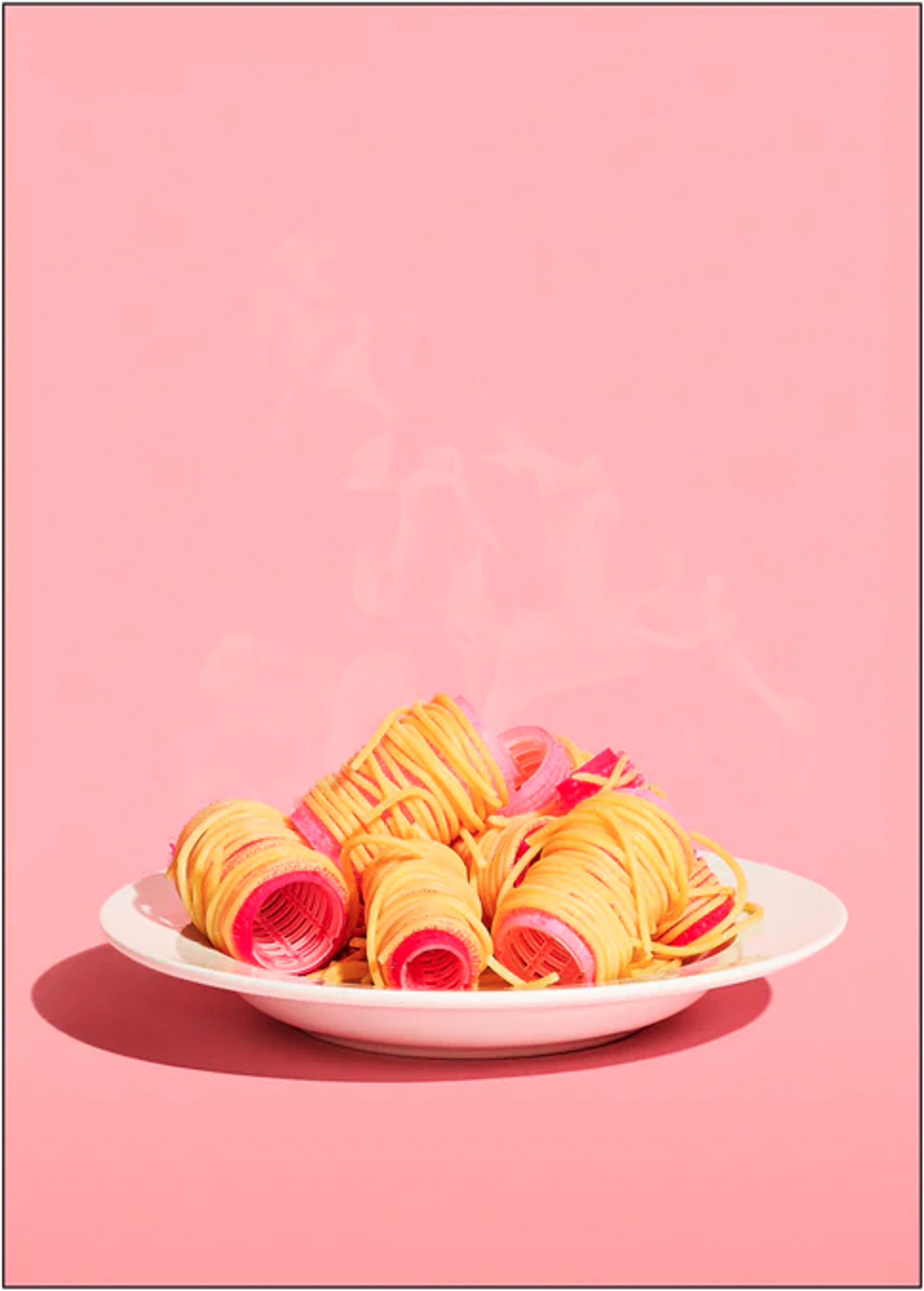 Warm spaghetti around curls, on plate with a pop of pink background.