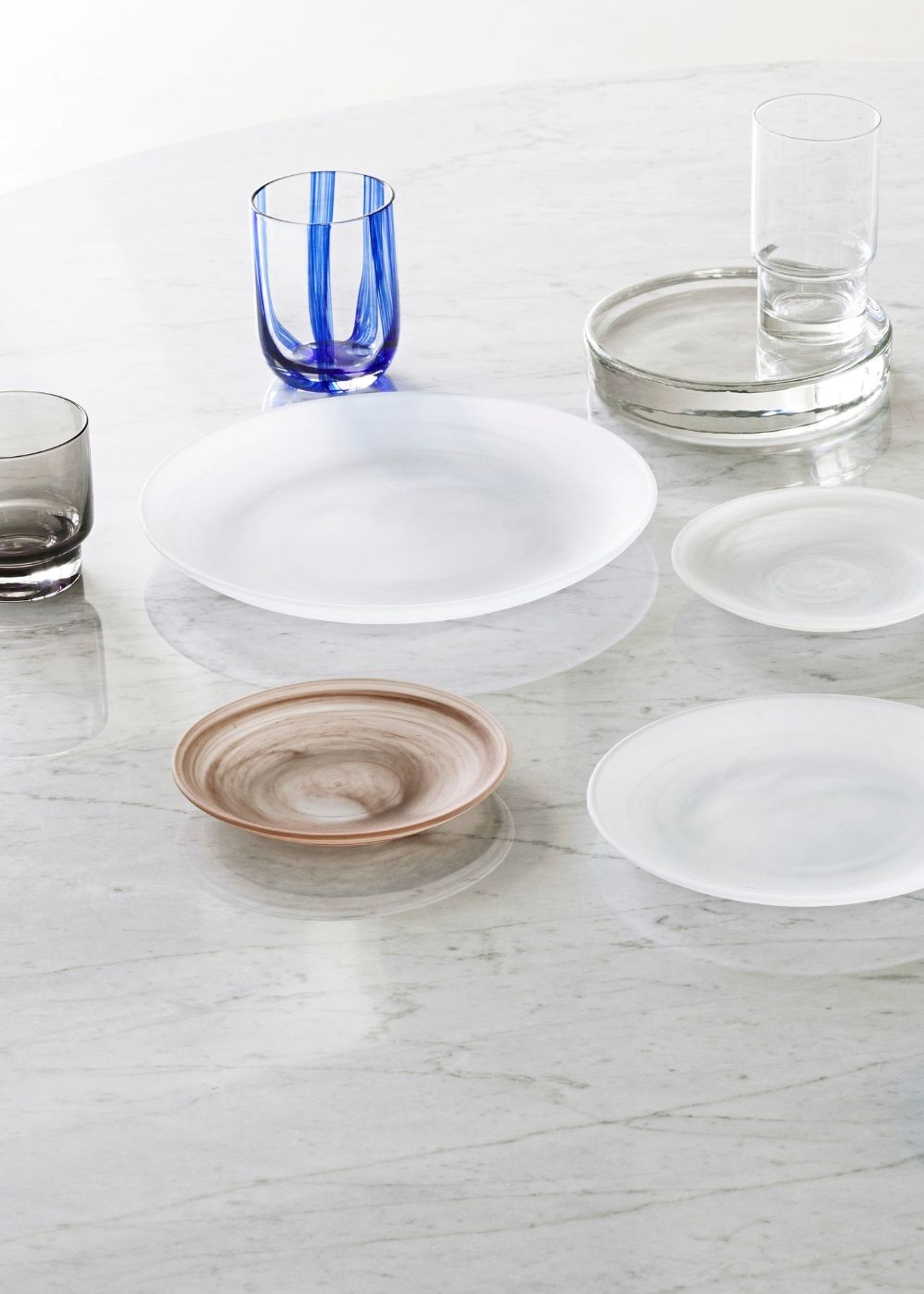 The Cosmic plates from Normann Copenhagen is a nice series in hand-blown glass with 3 plates and 1 deep plate. The unique thing about these plates is that they are mouth blown so therefore each simple has their own unique design with they have white pattern. The plates are both minimalistic when you glance at them but if you do in depth you see this fine pattern. You can collect this range on its own but you can also easily pair it with other things to give it a unique and personal twist.