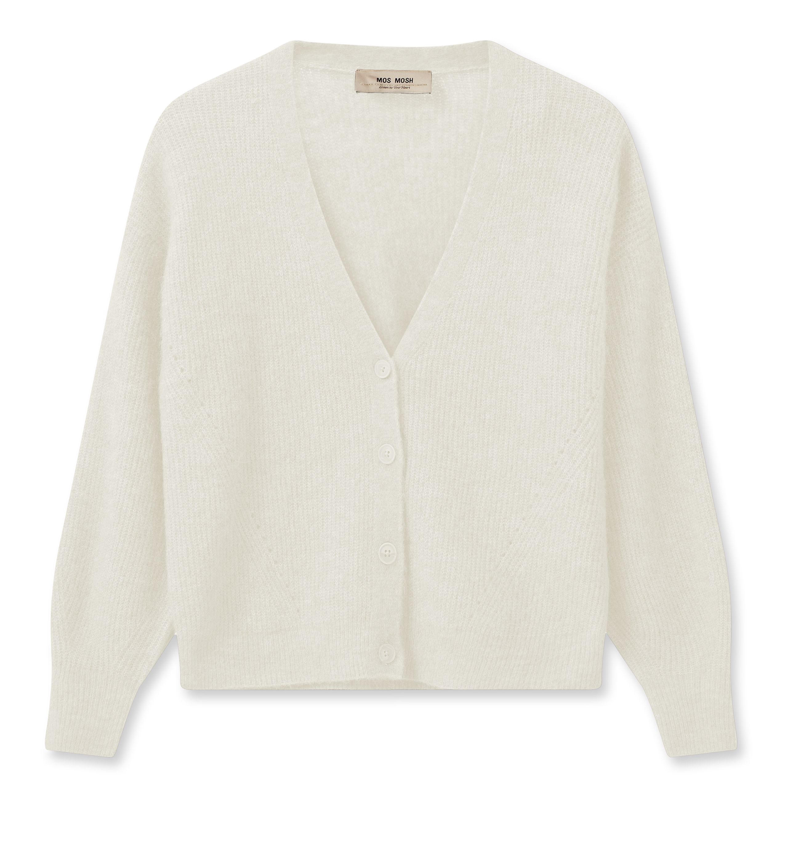 This knitted cardigan from Mos Mosh is a great classic that you can wear all year round. It's knitted in a soft, lightweight alpaca/wool blend and designed with a flattering V-neckline. The cardigan is made with a slightly shortened fit and is perfect with jeans or over a dress.