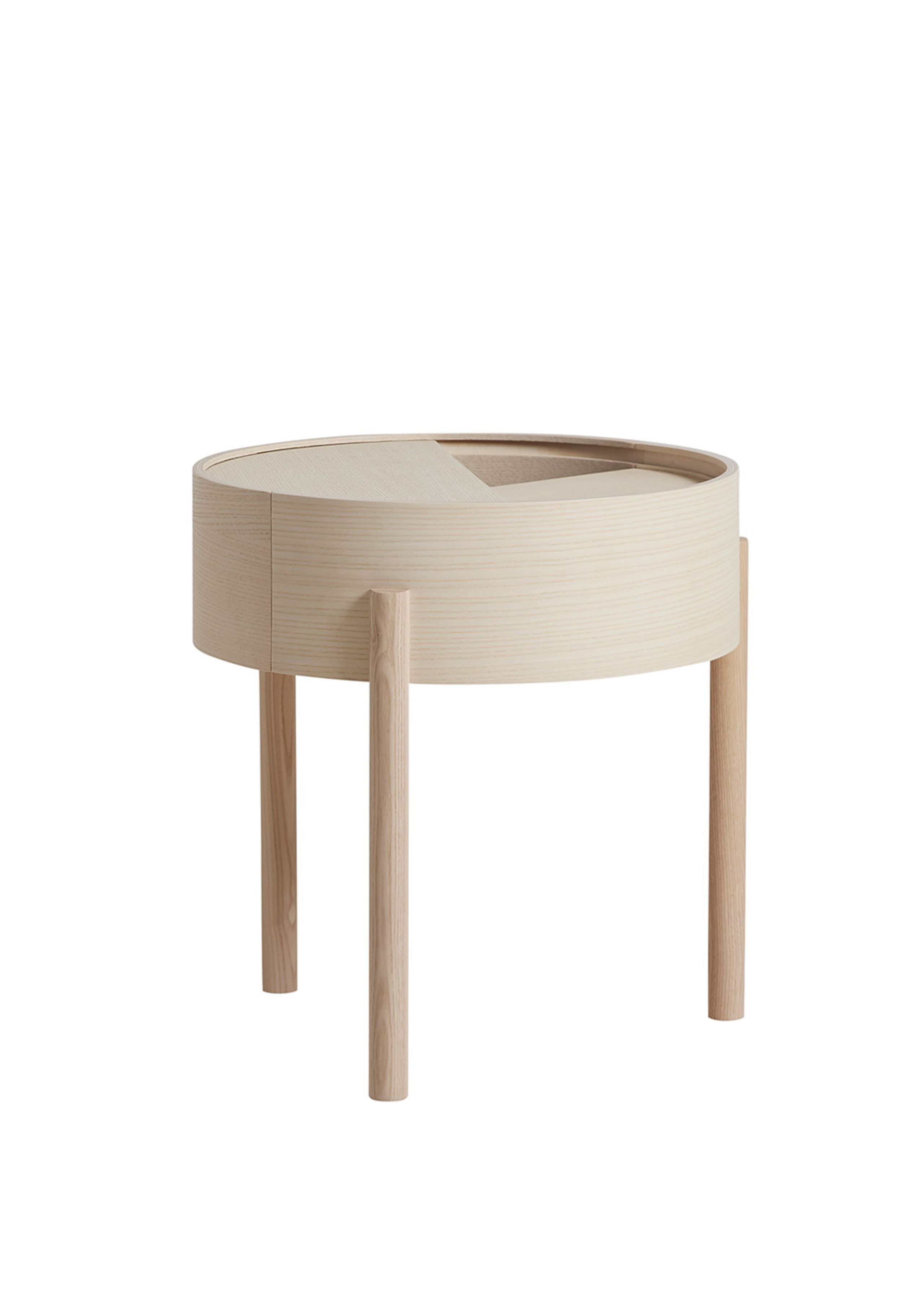 ARC Side table and coffee table are designed by Julie Begtrup and Ditte Vad. The name comes from the mathematical concept of a smooth curve connecting two points in a circle. The tables have functional features that it encourages the user to use. You can easily open the top table with a finger. The table top can be left open to display your favourite things, but you can also leave the lid closed to hide the things inside.