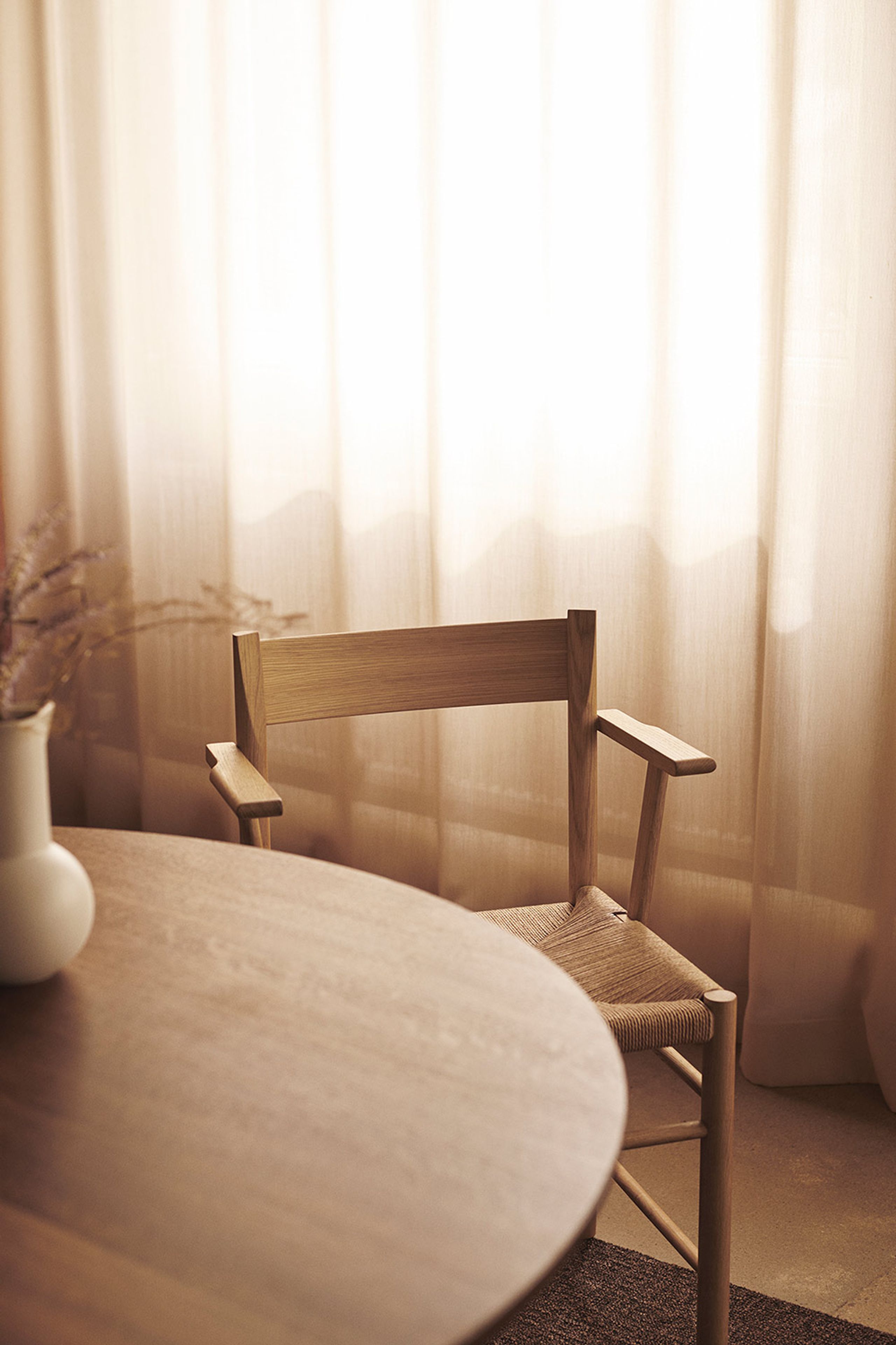 The F-Chair is the result of a collaboration between Brdr. Krüger and the Danish designer Rasmus Bækkel Fex, who has created this new interpretation of the classic shaker chair. The chair is known for its folksy design and is extremely practical for the everyday home, while having a timeless and stylish look. The pedestal is made of solid beech or oak with soft edges and a solid construction that makes it ideal for everyday use as well as a seat made of polyester wicker in a beautiful geometric pattern.