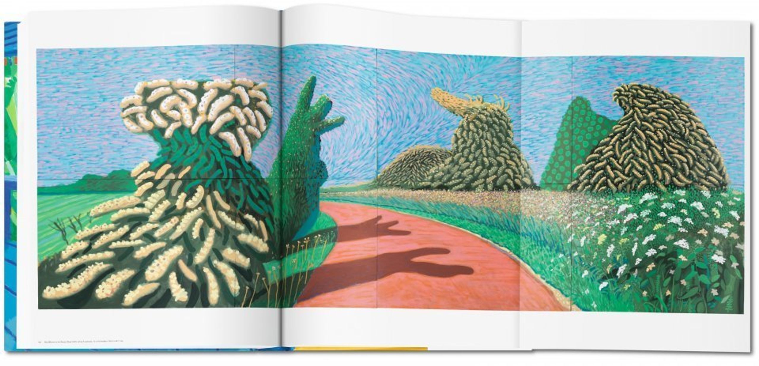 Never before has Hockney’s oeuvre been published on such an astonishing and immersive scale. As each page unfurls in a blaze of blues, pinks, greens, and oranges, we are spellbound both by the artist’s vibrancy as a colorist and his extraordinary sense of the conditions of the world that surrounds us. Through Hockney’s restless interrogation of perception and representation, we witness the mellow sheen of light on a muddy Yorkshire puddle, the ochre enormities of A Bigger Grand Canyon, the rustic majesty of Bigger Trees near Warter, and, of course, A Bigger Splash, with the exquisite sparkle of a turquoise pool beneath an iridescent California sky. These major paintings are joined by the artist’s drawings, photo-composites, multi-perspective collages, stage designs, multi-camera video works, and iPad drawings, each a panoply of looking and showing in different styles and media.