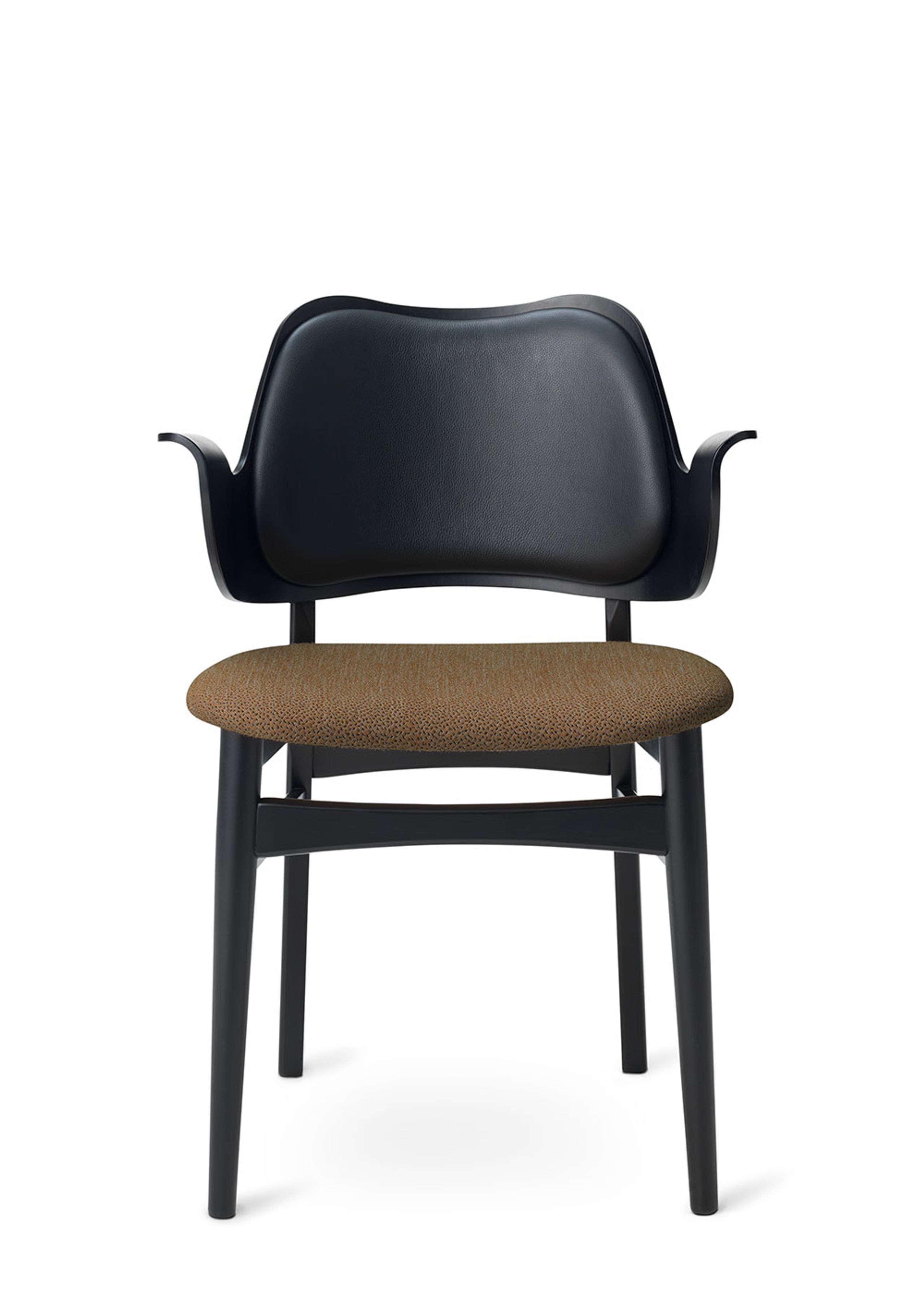 Designed by Danish furniture architect Hans Olsen back in 1957, the 'Gesture Chair' clearly reflects the characteristic features of 50s furniture architecture. As the name indicates, the chair has an inviting interior, with the curves of the armrests and back providing a soft design. The chair's design possesses a natural weight that is modernised with light details and bold combinations of textile and leather.
