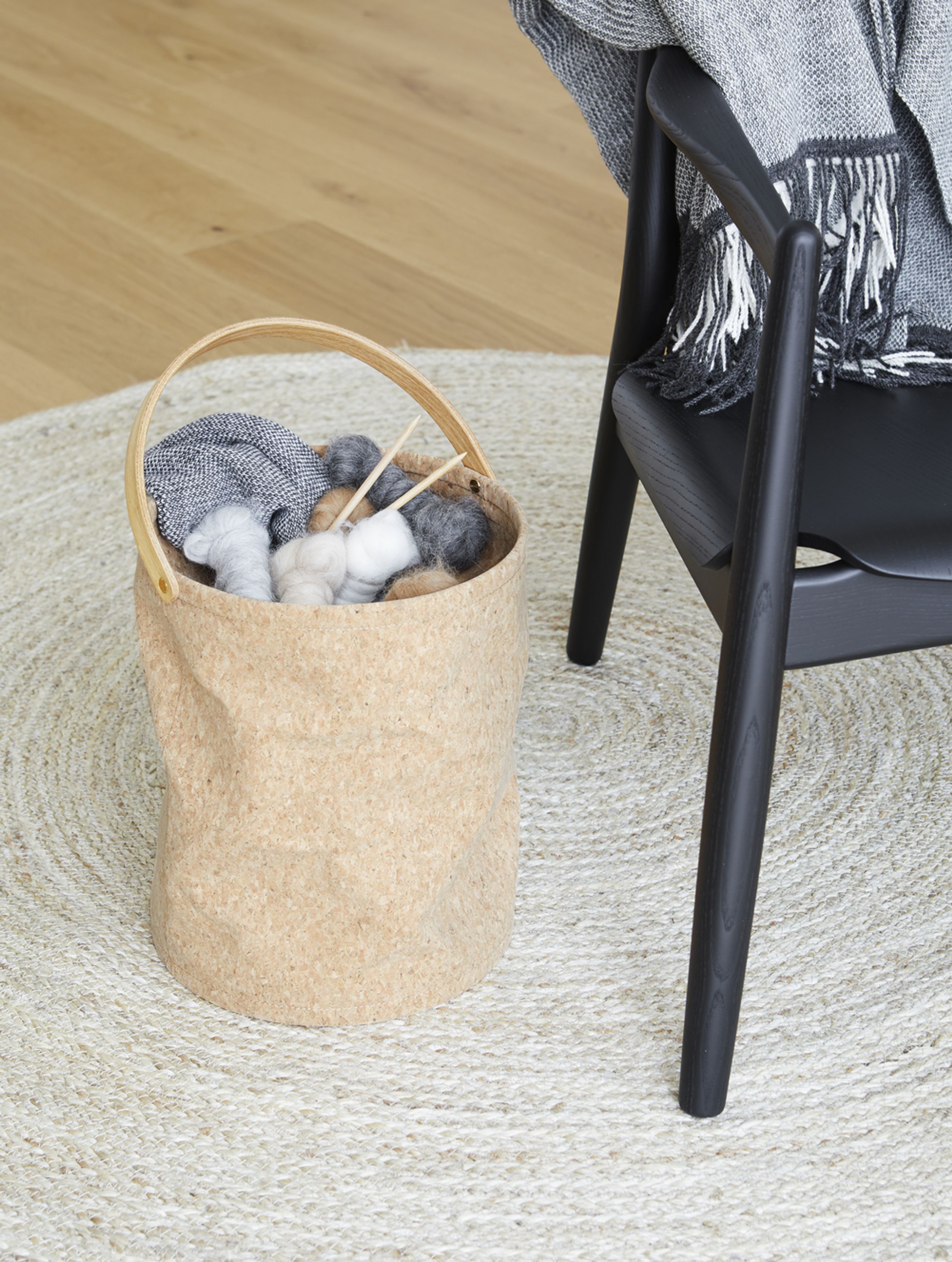 The paper container made of cork is intended as the classic wastebasket, but also intended for ordinary use in the home as a magazine rack or for various everyday objects. The trash is made up of double layers of ultra-fine cork fabric. The fabric is hand-sewn together. The two main functions of the basket are to be carried and to be folded. The trash is designed by Hallgeir Homstvedt.