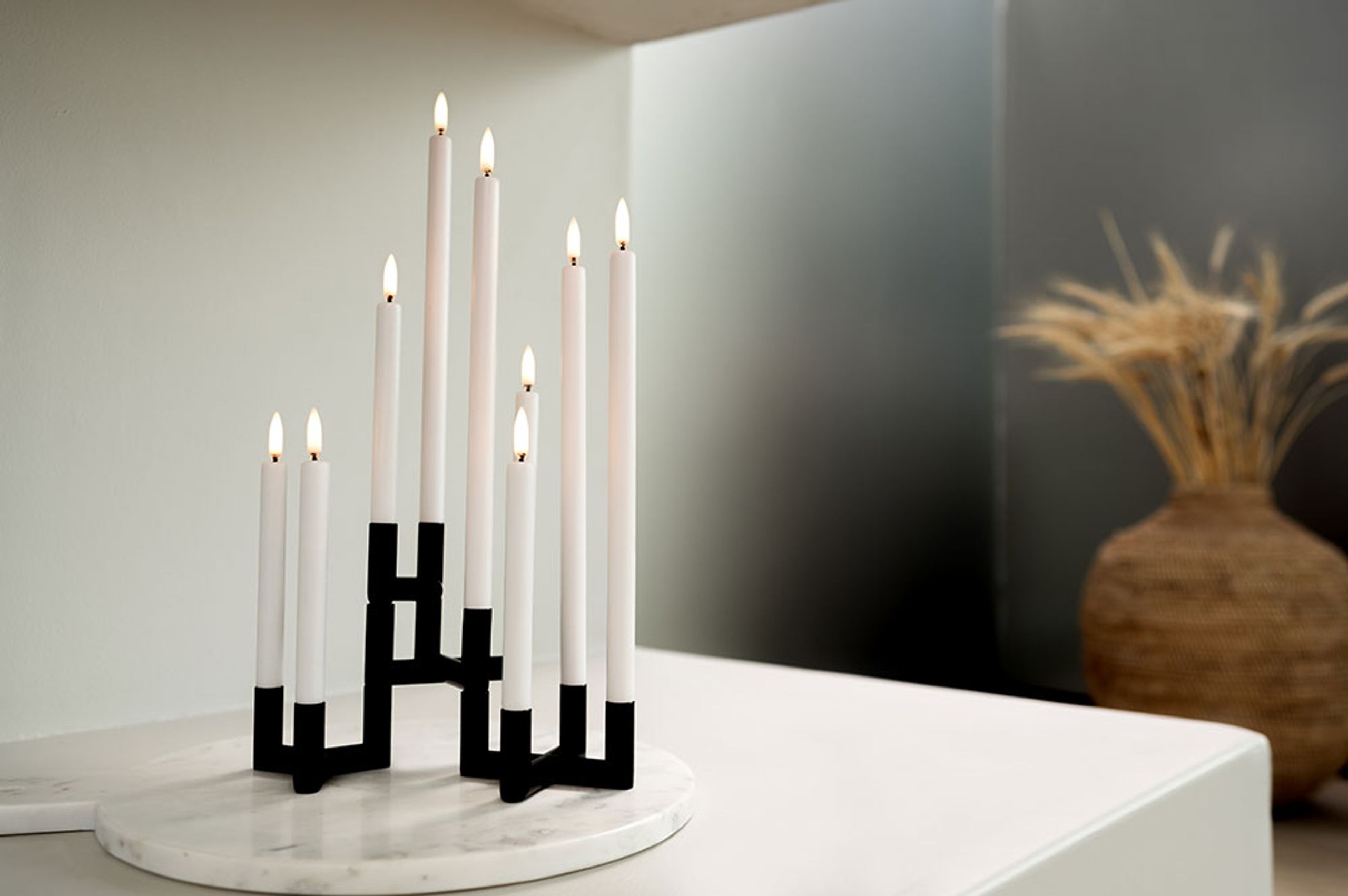 The simple and elegant LED Taper Candle is designed by Uyuni. The traditional candles are made of paraffin wax. The idea behind the LED Taper Candle was to design a candle that eliminated the risk of the chemical compounds that are released during a normal combustion process. The LED Taper Candle is recreated with the same basic principles of purpose and design, and is therefore made in LED, which has 3 dimming options, as well as 4 timer settings: 4, 6, 8 & 10 hours. The candles are sold in one pack of two candles.