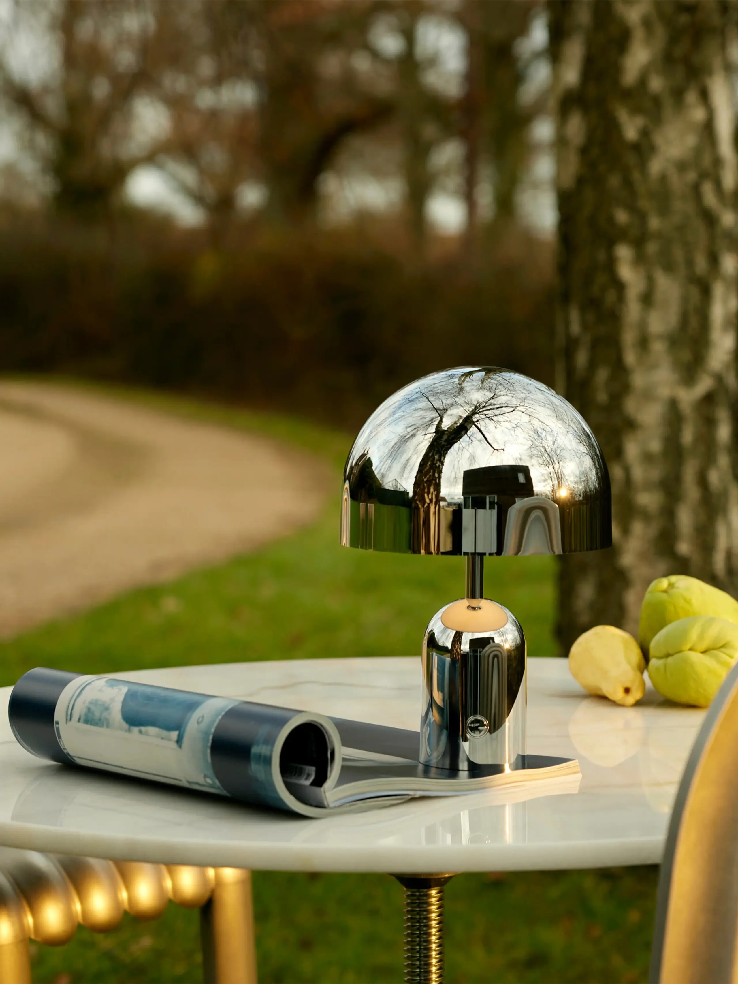 Bell Portable Led de Tom Dixon es una elegante interpretación del minimalismo industrial, diseñada en un distintivo alto brillo que refleja maravillosamente su entorno. Fabricada en acero prensado cromado y con un discreto difusor integrado, la lámpara proyecta una luz suave y atmosférica. Su icónica silueta, inspirada en los parachoques de los coches clásicos, combina funcionalidad con una presencia casi escultórica.
