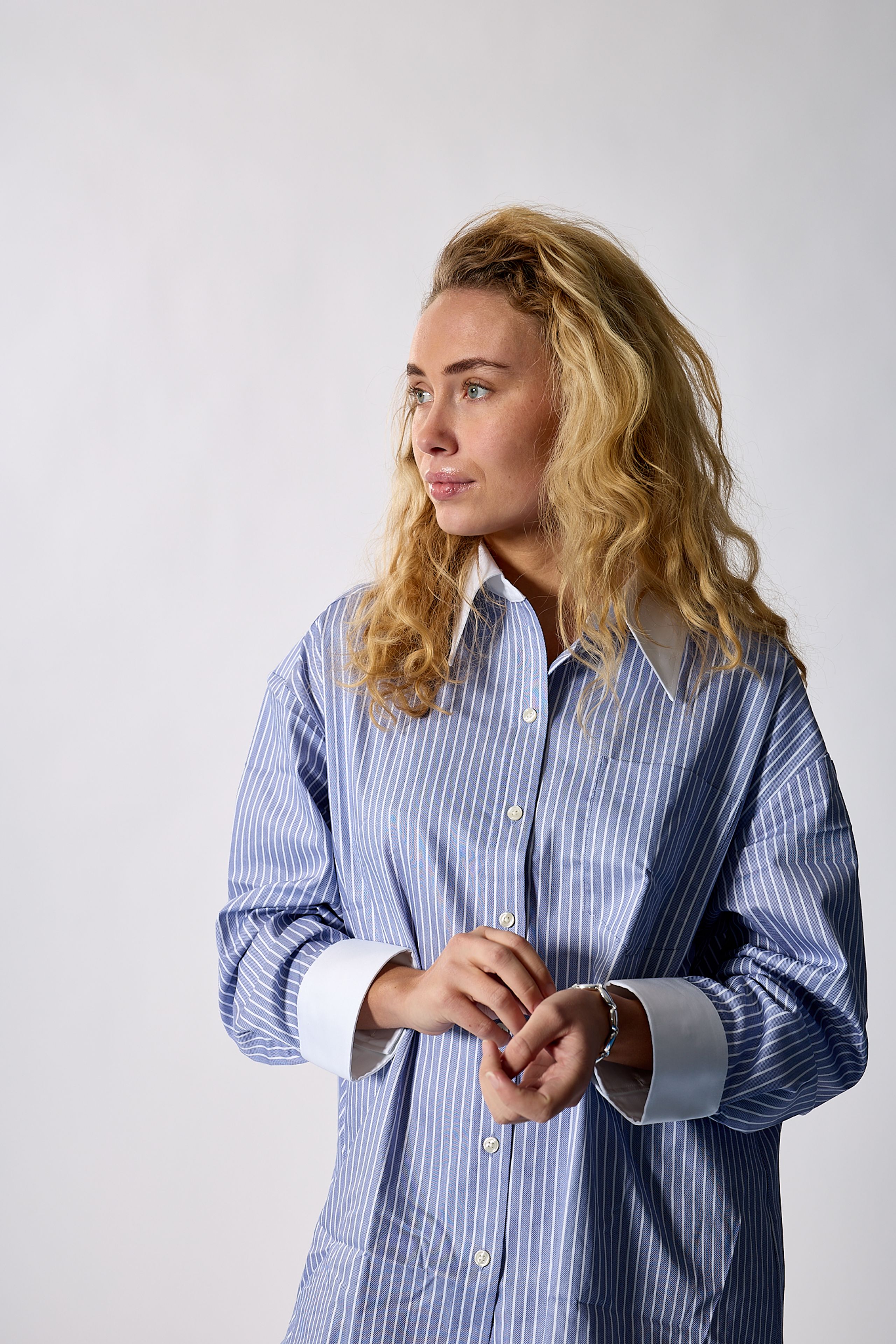 Klassinen ja hieno paita Selected Femmeltä. Paidassa on ylisuuri leikkaus, hienoja yksityiskohtia valkoisilla reunoilla hihassa ja kauluksessa, ja se on valmistettu 60 % luomupuuvillasta. Täydellinen raidallinen paita perusvaatekaappiisi.