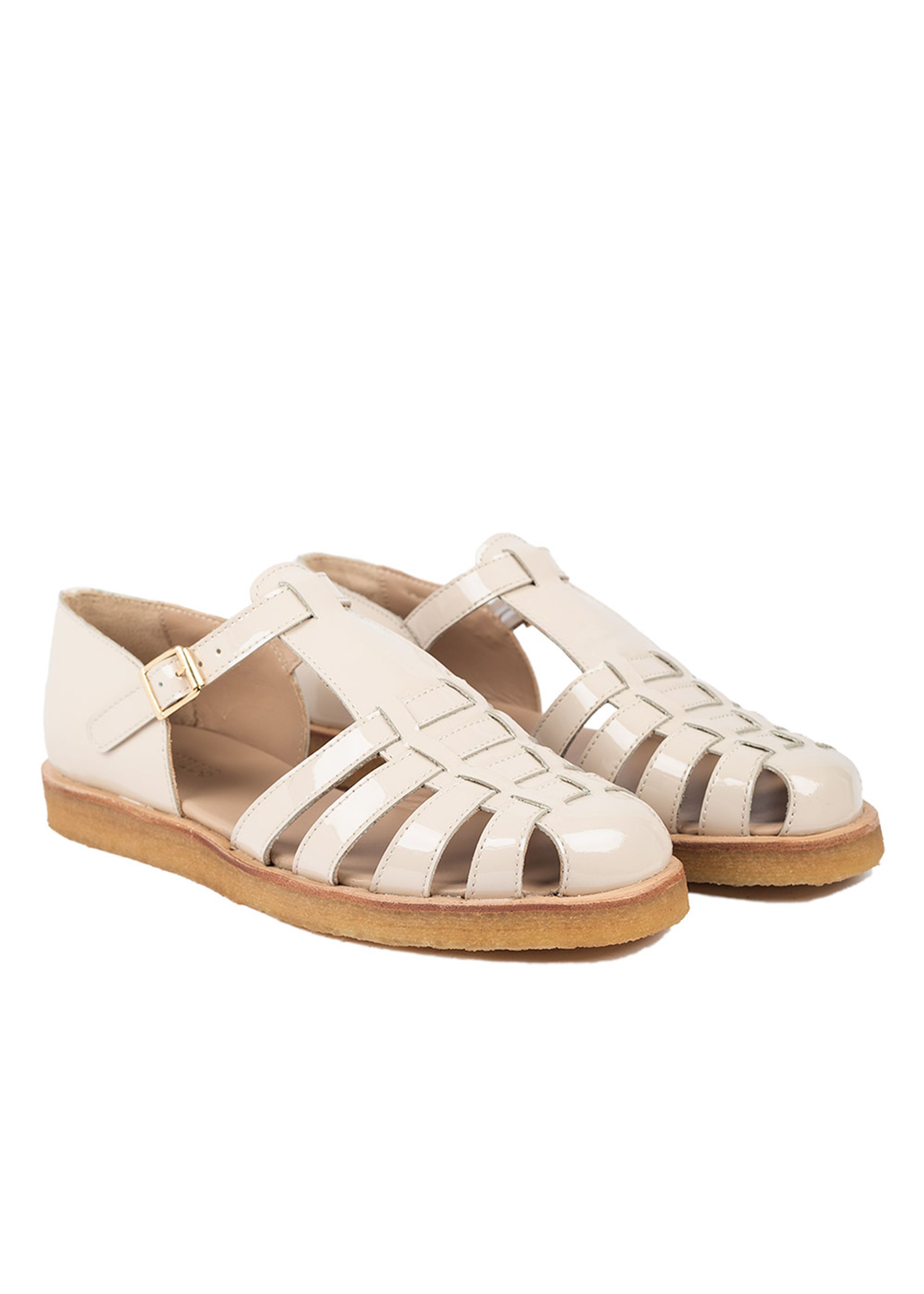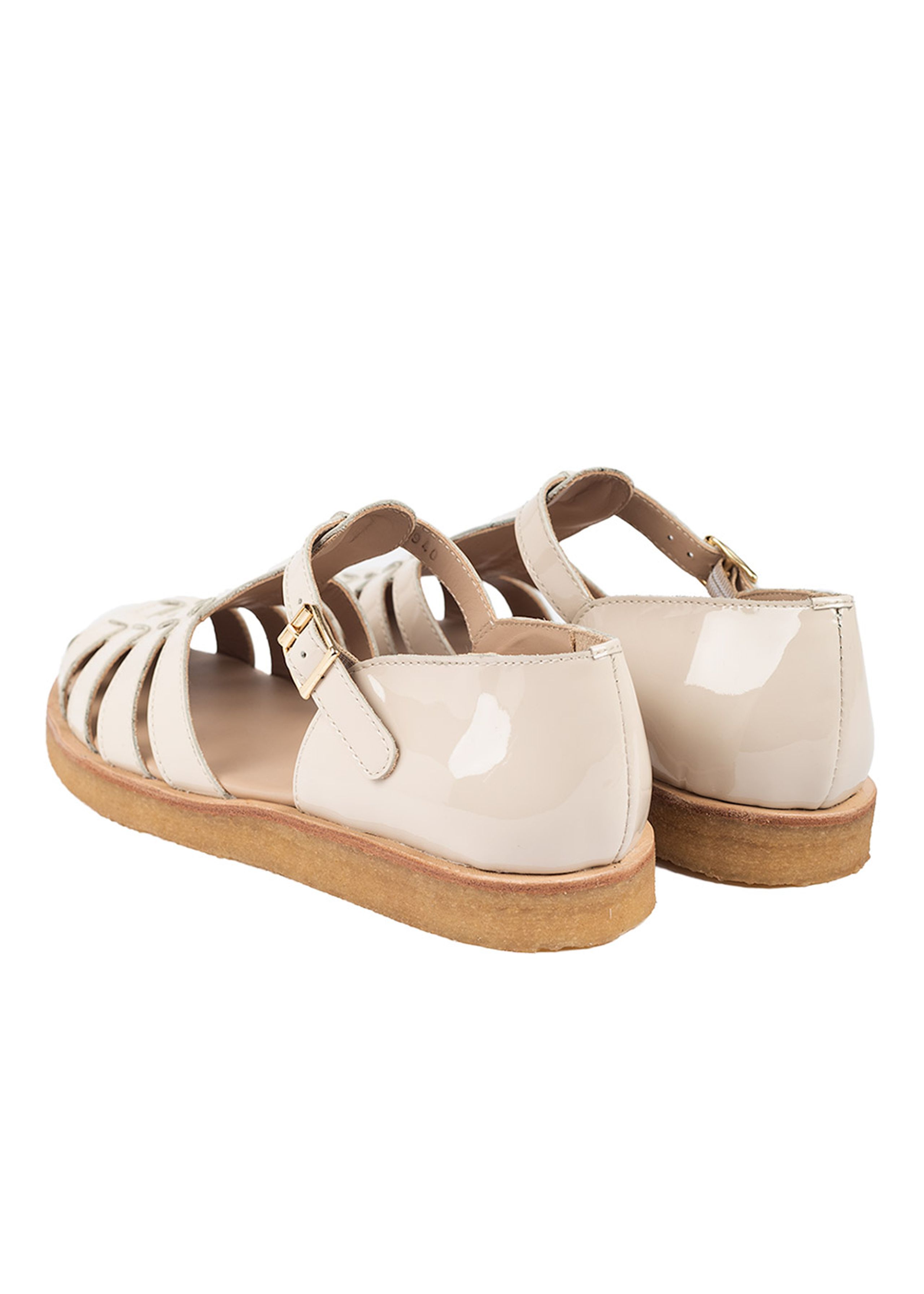 Belle sandale avec un grand confort de la part d'Angulus. Fabriqué en cuir avec une semelle en caoutchouc brut souple. La sandale est partiellement fermée à l'avant et se ferme avec une boucle en or fin.