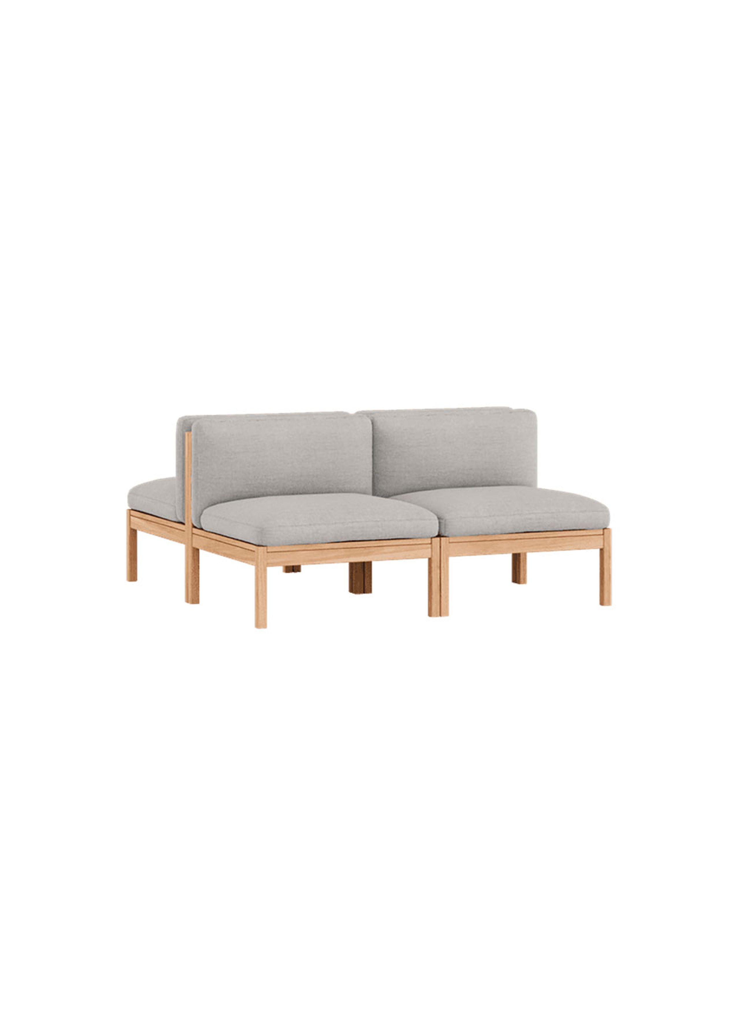 Mixed Combination A de MOEBE est un canapé modulaire qui allie fonctionnalité et confort dans un design intemporel. La structure du canapé est composée de chêne et de placage de chêne certifiés FSC, traités avec une huile dure qui protège et met en valeur la beauté naturelle du bois. Les pieds sont fixés à l'aide d'un système innovant de supports métalliques qui permet de créer des sièges simples ou des arrangements complexes à angles multiples. Son revêtement est disponible dans une gamme de tissus de haute qualité du fabricant danois Kvadrat, à savoir Re-Wool 2, Field 2 et Autumn, ce qui confère au canapé à la fois un aspect élégant et un profil environnemental responsable.