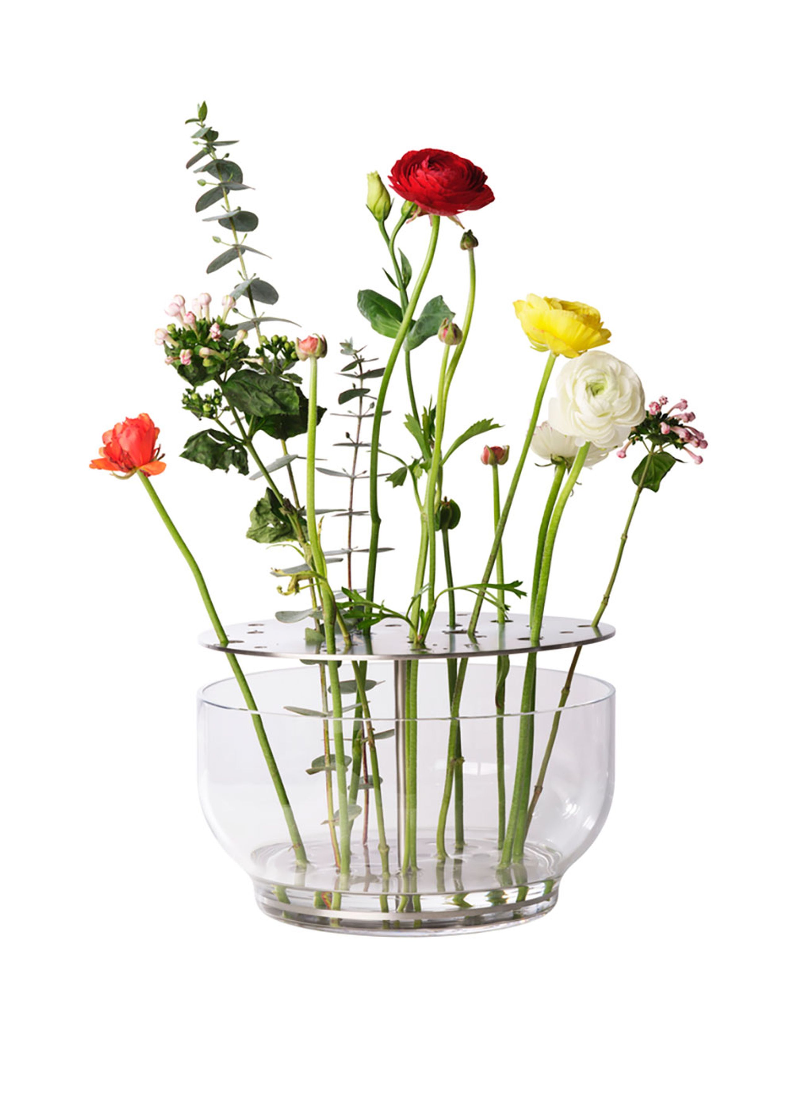Inspiré par l'amour des Japonais pour les fleurs, le designer Jaime Hayon a créé le vase IKEBANA qui vise à montrer la fleur dans son ensemble, de la tige au pétale. Le vase est fait de verre transparent soufflé à la main combiné à un centre en or, composé de deux plaques avec des trous différents. Les trous permettent de mettre en valeur chaque fleur individuelle et de créer une expression accrocheuse.