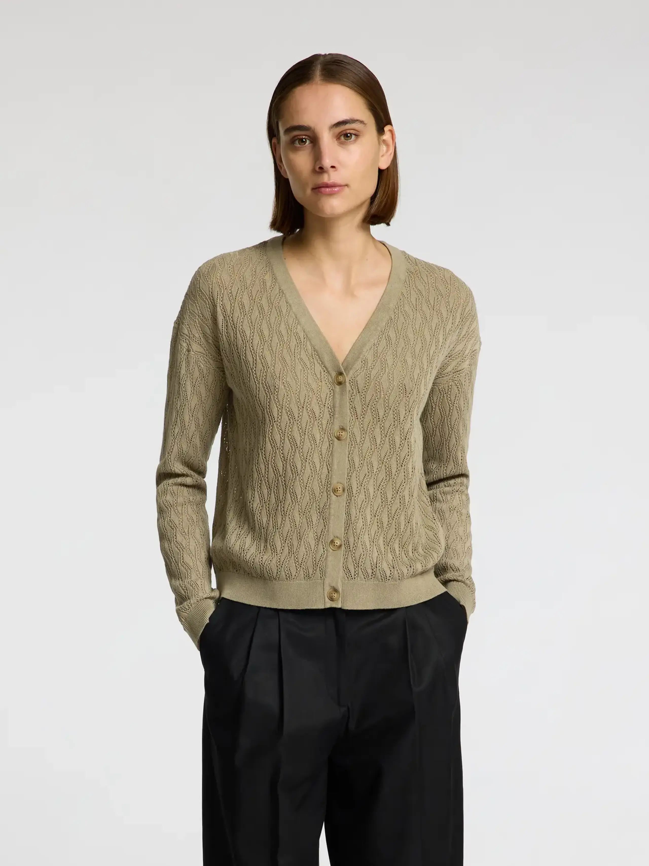 Cardigan femminile in un delizioso misto cotone e lino di Selected Femme. La maglia è realizzata con un elegante motivo a buchi, ha bottoni al centro e uno scollo a V quando è chiuso. Perfetto per la stagione e di qualità leggera.