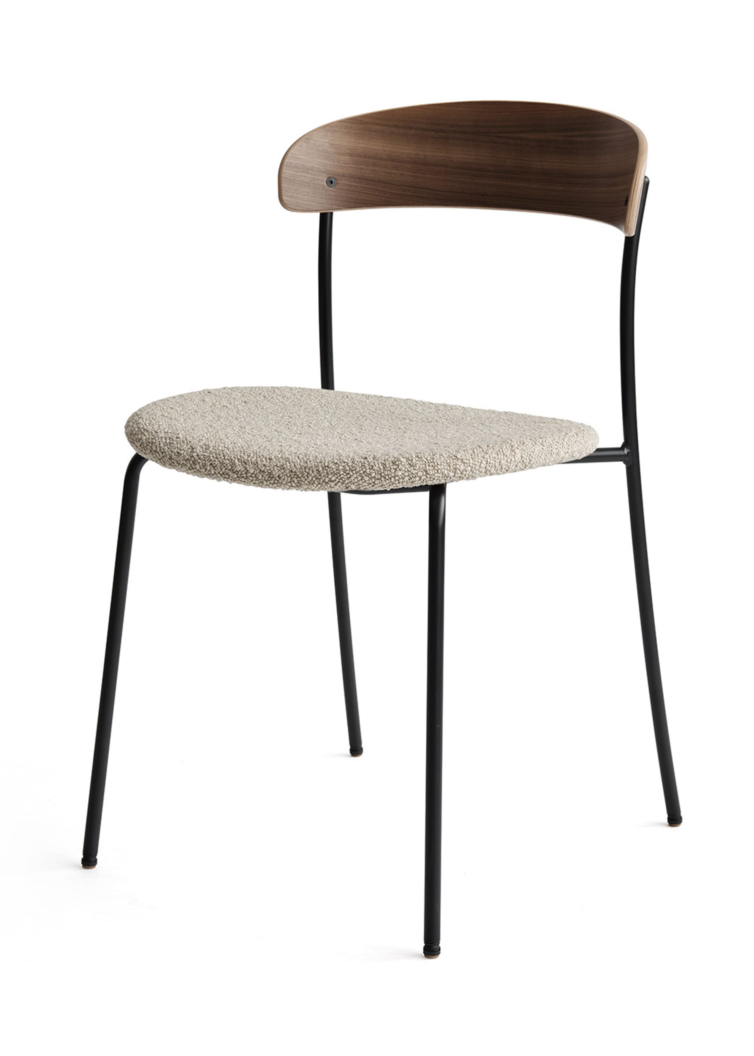 - Materiale: Struttura in acciaio verniciato a polvere con sedile e schienale imbottiti e impiallacciati in rovere, frassino o noce.