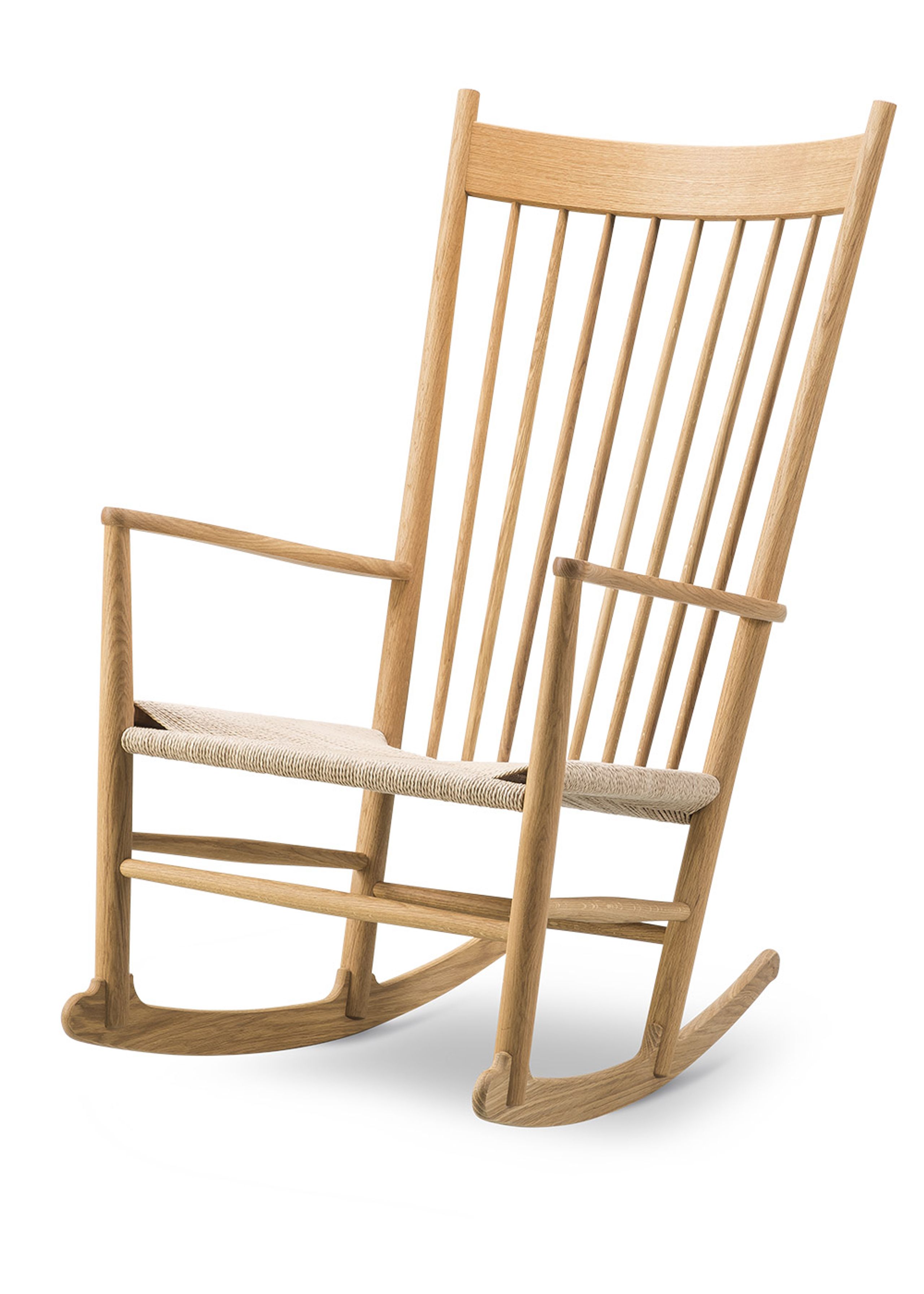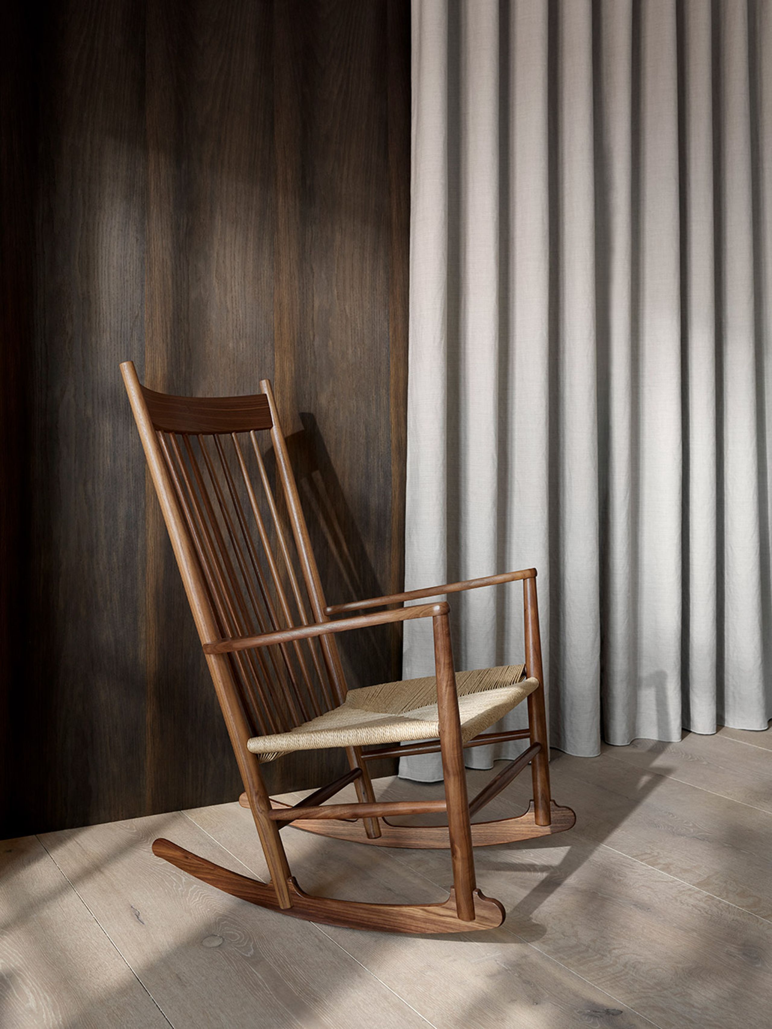 La 'J16 Rocking Chair' è uno dei molti mobili che si distinguono nella collezione di Wegner come un vero classico. La sedia a dondolo, come tipo di mobile, catturò l'interesse di Wegner all'inizio della sua carriera, che fu una delle ragioni per cui la 'J16' fu una delle prime sedie di Wegner ad andare in produzione. Nato nel 1944, quando fu prodotto per la prima volta, l'iconico pezzo d'arredamento festeggia 75 anni sul mercato, segnati da un lancio della sedia presso Fredericia Furniture. Prima di allora, la sedia a dondolo ha subito aggiustamenti nella produzione per semplificare il più possibile il metodo di produzione senza compromettere la qualità esclusiva. Ed è proprio questa qualità che Fredericia Furniture assicura, con la sua squisita falegnameria che abbraccia l'originalità dei mobili. Negli anni '50, il legno scuro era particolarmente caratteristico per i mobili in Danimarca, come si può vedere anche nel nuovo lancio, ma in linea con la nuova era, la sedia a dondolo è ora disponibile anche in rovere più chiaro e noce caldo.