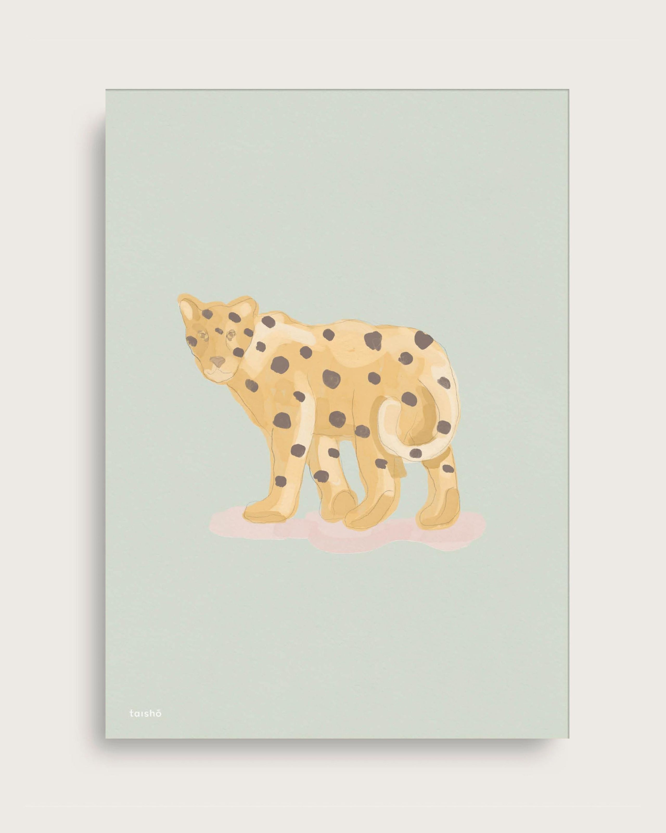 De 'Green Cheetah' poster van Taishō, heeft een groene achtergrond met daarop een majestueus jachtluipaard. De lieve uitdrukking van de poster en de zachte penseelstreken brengen gezelligheid in de kinderkamer. Mix het met de andere kinderposters van Taishō en creëer een unieke kleine fotomuur voor uw kind.