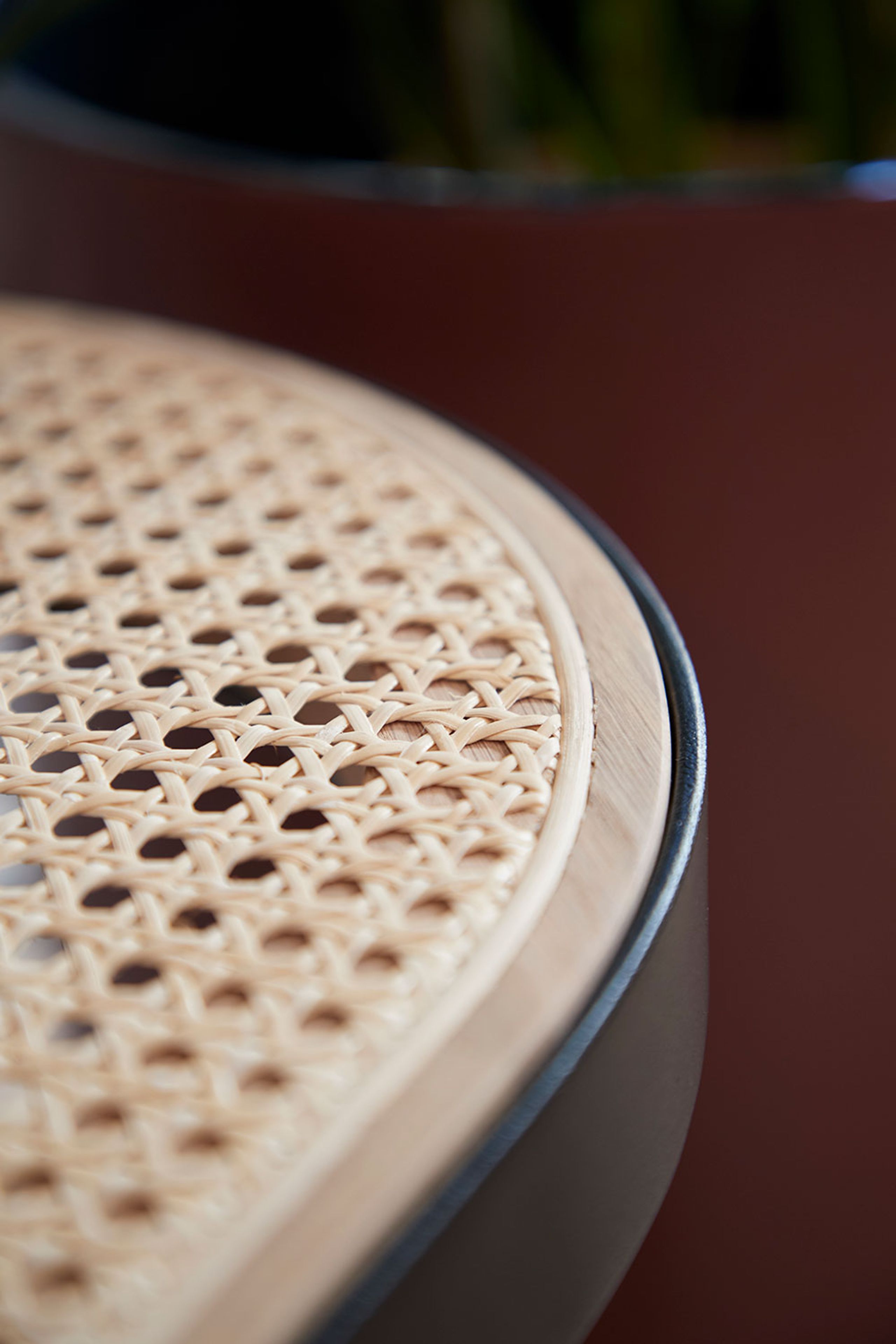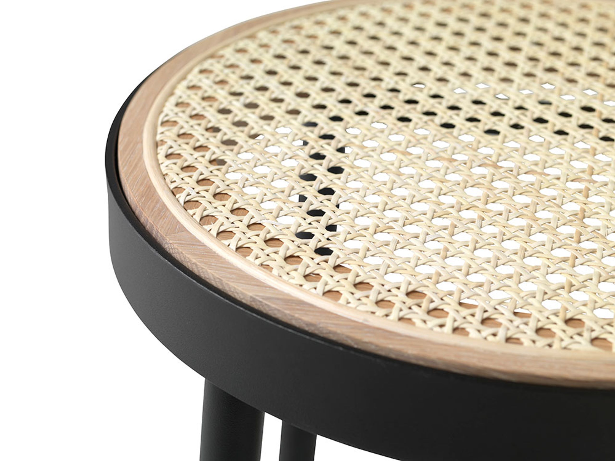 - Rama z czarnej stali malowanej proszkowo z siedziskiem z litego olejowanego dębu i francuskiej wikliny