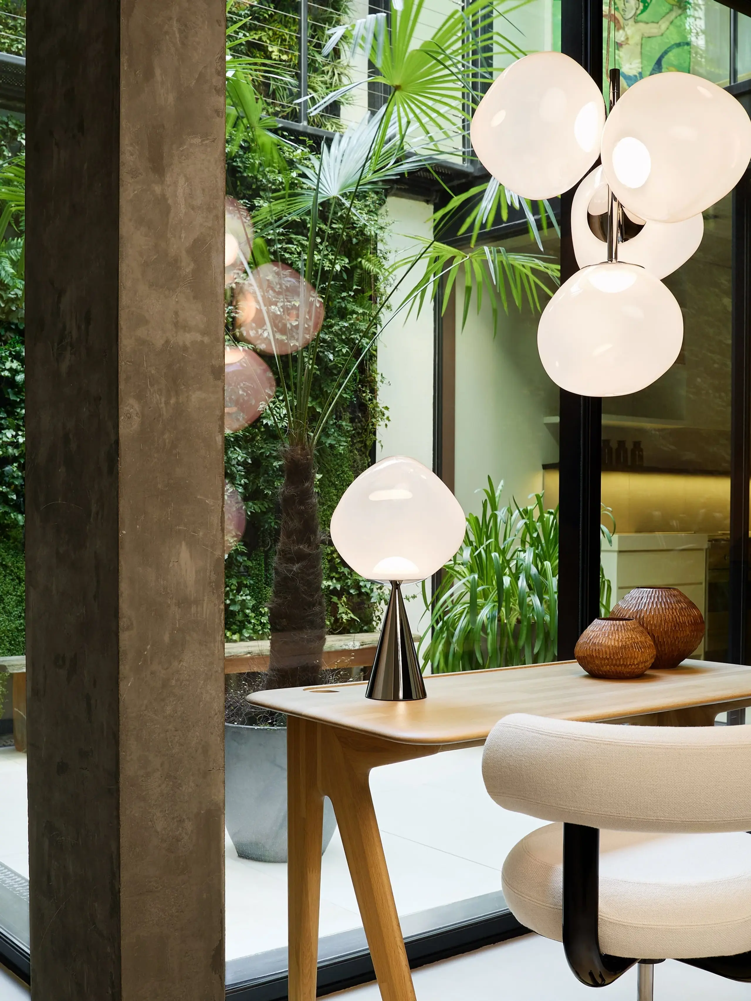 Lampa stołowa LED Melt Cone Fat marki Tom Dixon to kuszący element projektu, w którym rzeźbiarska forma spotyka się z zaawansowaną technologią. Charakterystyczna kopuła, wykonana metodą formowania rozdmuchowego i metalizacji próżniowej, wygląda jak stopione szkło i emanuje niemal płynną elegancją. Po włączeniu pojawia się ciepły, organiczny blask; po wyłączeniu przekształca się w lustrzany obiekt o wysokiej wartości dekoracyjnej. Stożkowa podstawa zapewnia zrównoważony kontrast z lśniącą kopułą i dopełnia artystycznego wyrazu.