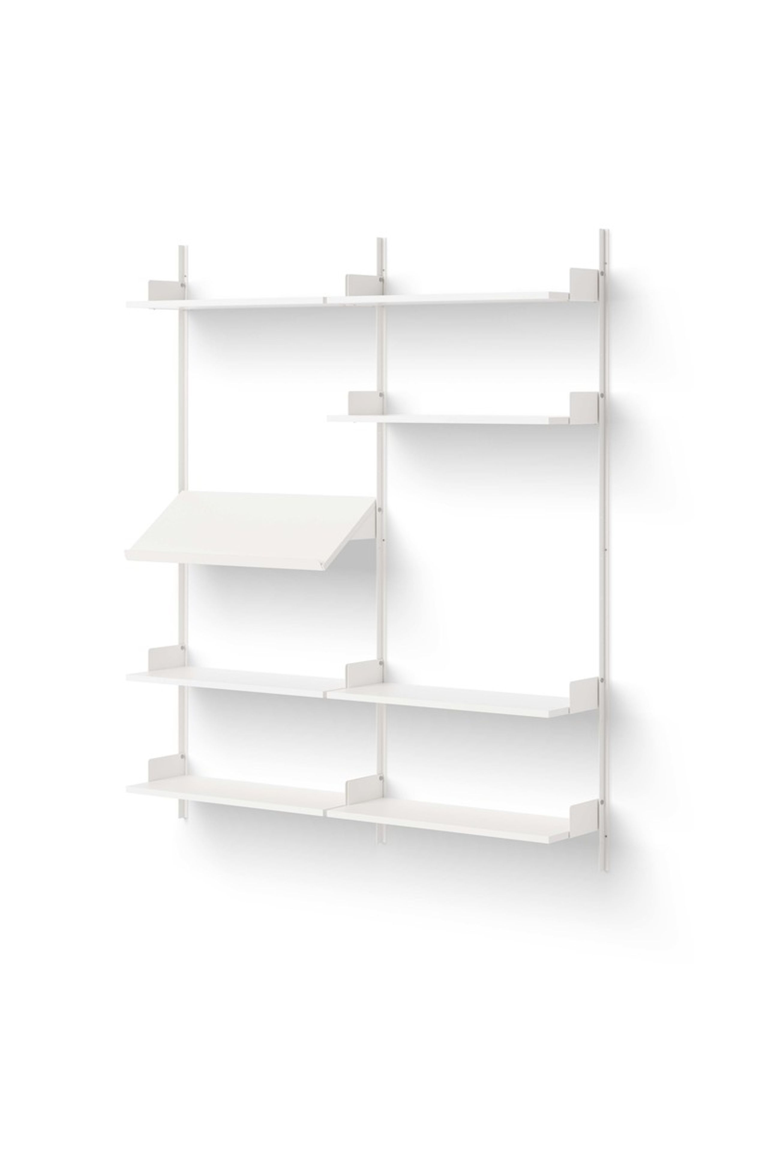 Prateleira multifuncional da marca escandinava New Works. A prateleira Living tem 7 prateleiras + 1 prateleira inclinada para exposição de livros abertos. Pendure-a na sala de estar ou escritório para decorações, livros e plantas.