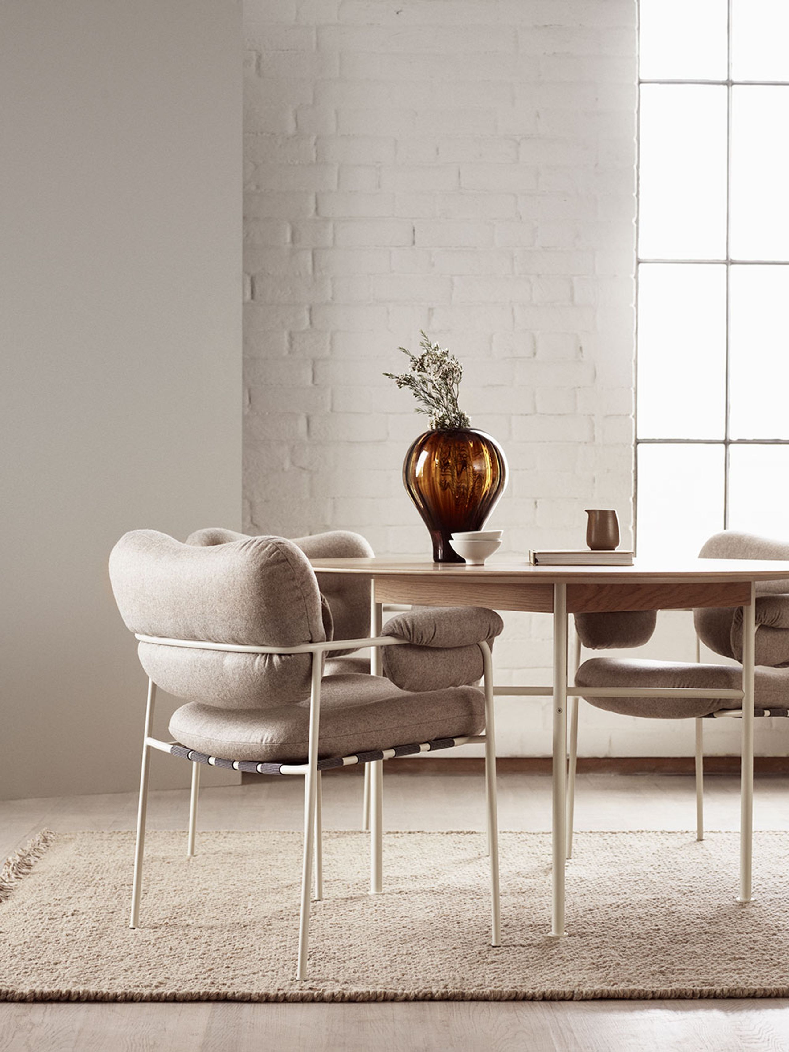 A "Spisolini" reflecte o seu design na icónica poltrona "Bollo", que é simultaneamente caraterística do designer Andreas Engesvik e do universo de mobiliário Fogia. A cadeira de jantar mantém o conforto soberbo da sua irmã, com proporções completamente novas que a tornam suficientemente fina para caber à volta da mesa de jantar, mas suficientemente volumosa para ocupar o espaço.