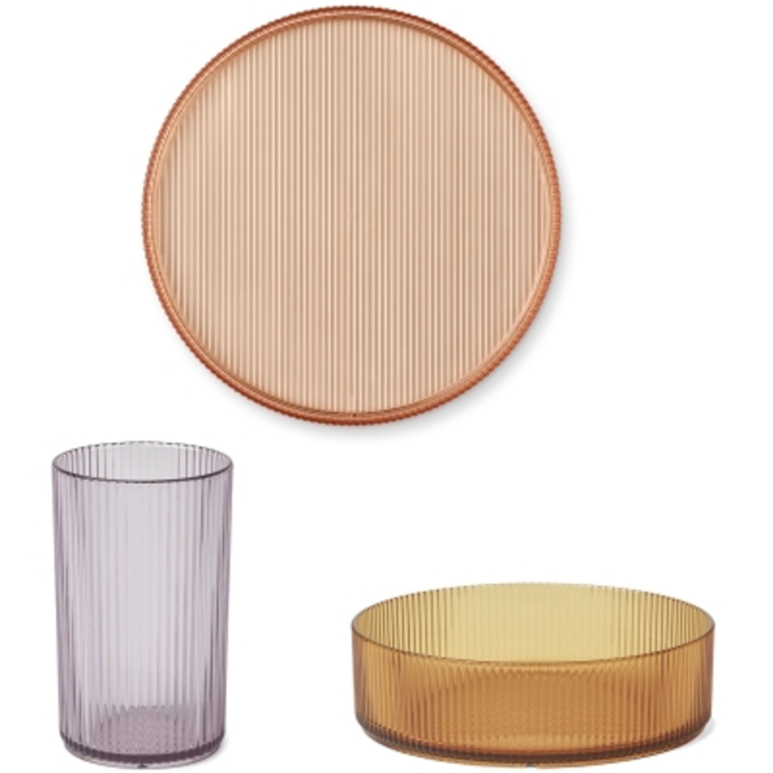Unique service set that features some incredibly colourful Tritan glass sets. The base has a grooved surface and is shatterproof, durable and long lasting material. Use these for your table and create a festive and summery table with the beautiful colors the rack has. The set includes Joel bowl, Johs plate and Farrel cup in three different colours.