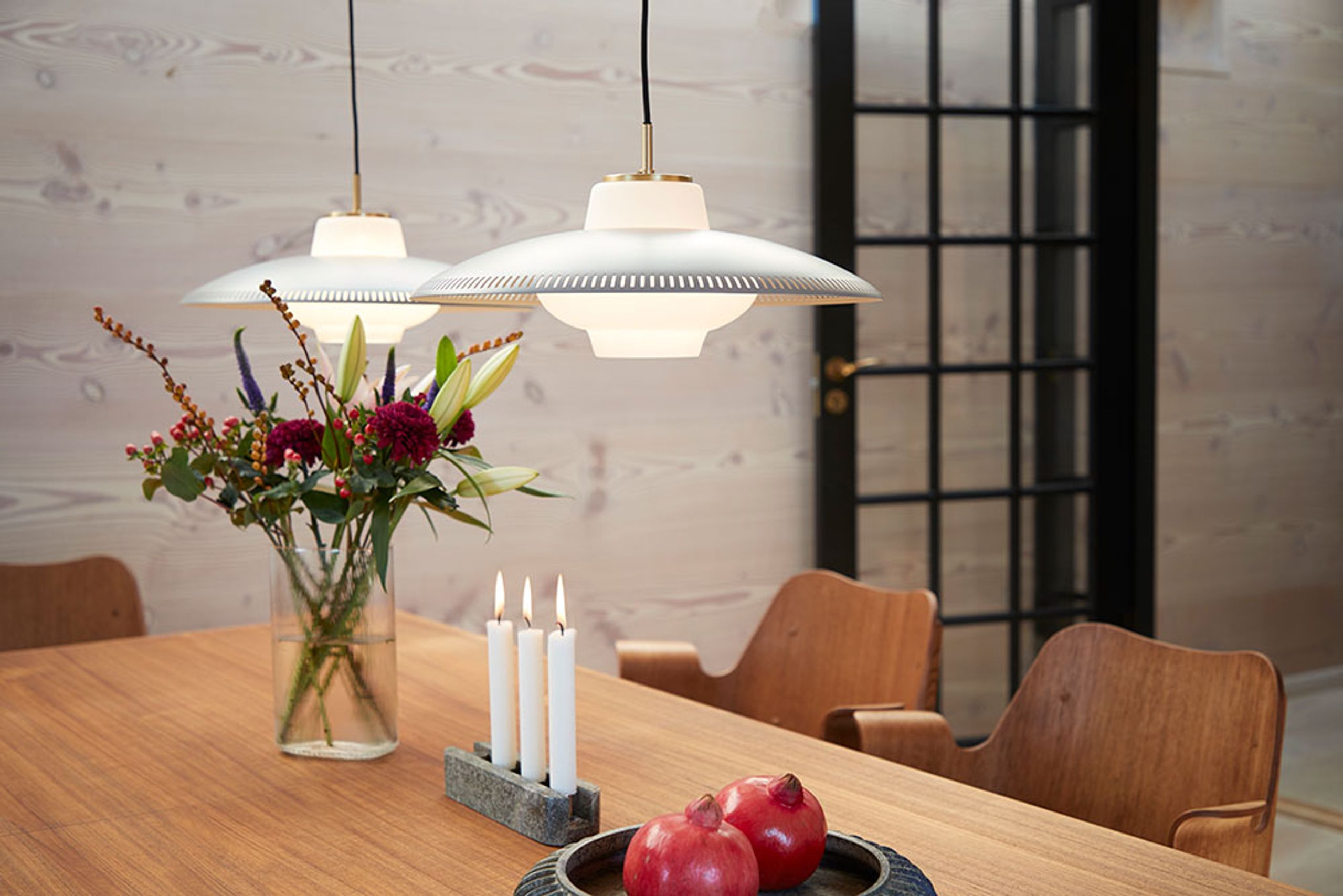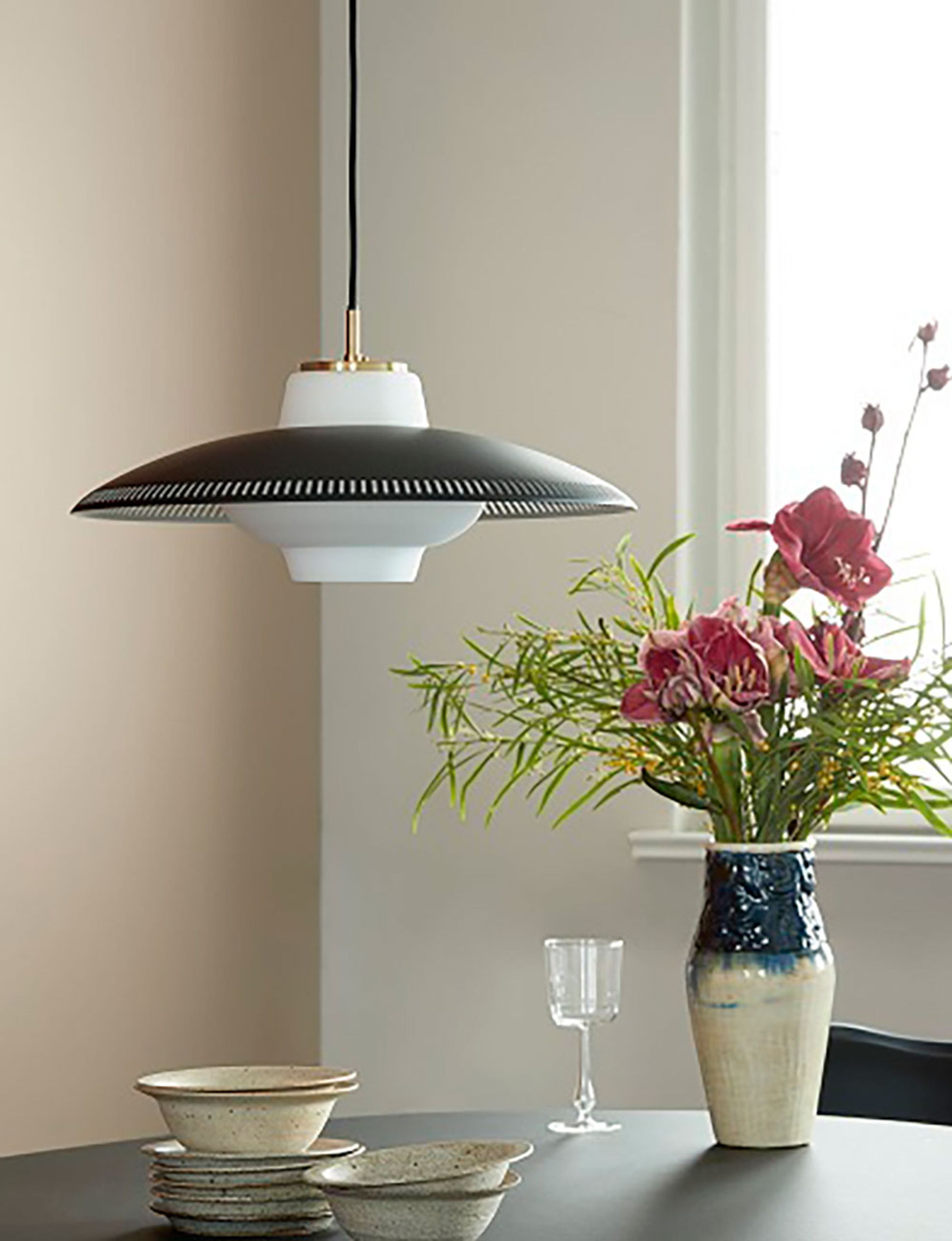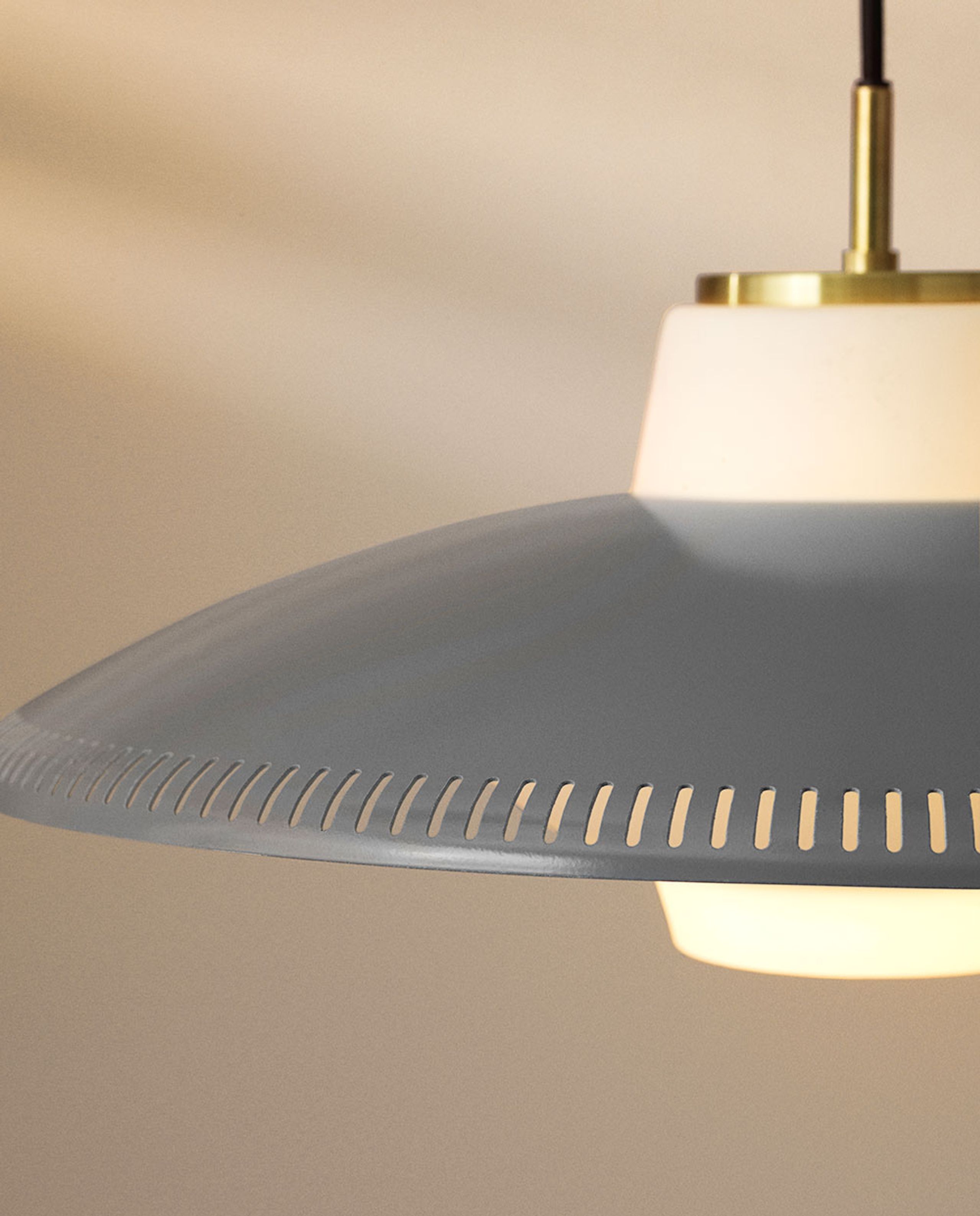 Opálové tienidlo, ktoré navrhol dánsky dizajnér osvetlenia Svend Aage Holm-Sørensen, vychádza z lásky mnohých dizajnérov svietidiel a majstrov osvetlenia k opálovému sklu v posledných desaťročiach. Rozptýlené a tlmené svetlo Opal Glass vytvára príťažlivú atmosféru, ktorá vás pozýva do miestnosti. Široké kovové tienidlo lampy pomáha vytvárať sústredené svetlo nad stolom, zatiaľ čo drážky tienidla pomáhajú osvetliť celú miestnosť špeciálnym svetlom, ktoré vydáva opálové sklo. Vďaka výberu známych farieb z teplého severského vesmíru, ako aj rafinovaným mosadzným detailom má lampa retro-moderný vzhľad, ktorým sa dá ľahko zariadiť domácnosť.