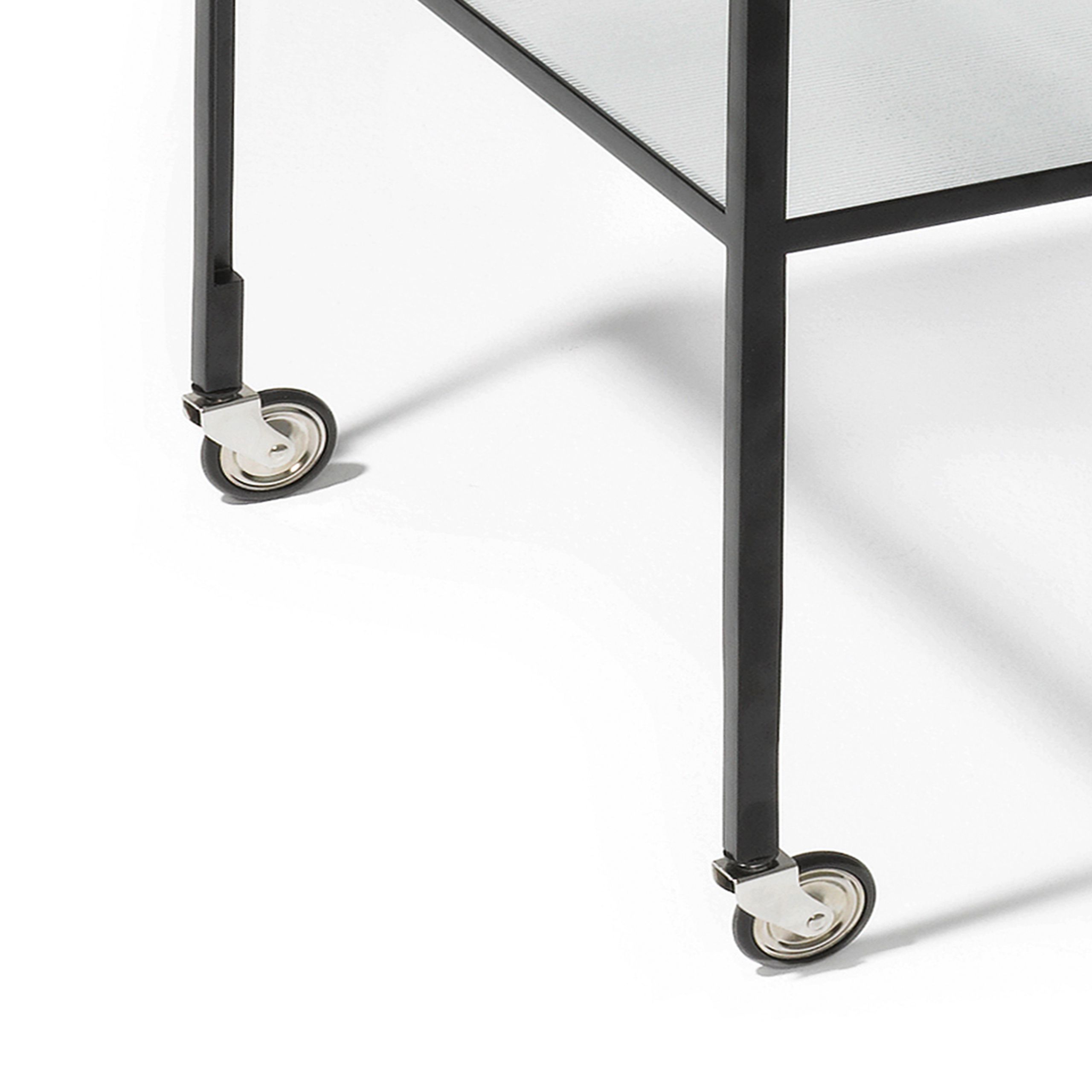 Bar Wagon od spoločnosti PLEASE WAIT to be SEATED, ktorý navrhol Herbert Hirche v roku 1956, je majstrovskou kombináciou minimalizmu a elegancie. Tento štýlový barový voz sa vyznačuje výrazným kontrastom medzi tenkou oceľou a štruktúrovaným sklom, čím vznikol vizuálne ohromujúci kus nábytku, ktorý je funkčný a zároveň estetický. Vďaka čistým líniám a sofistikovanému dizajnu je ideálny na vystavenie vašich najlepších fliaš whisky, ginu alebo iných liehovín.