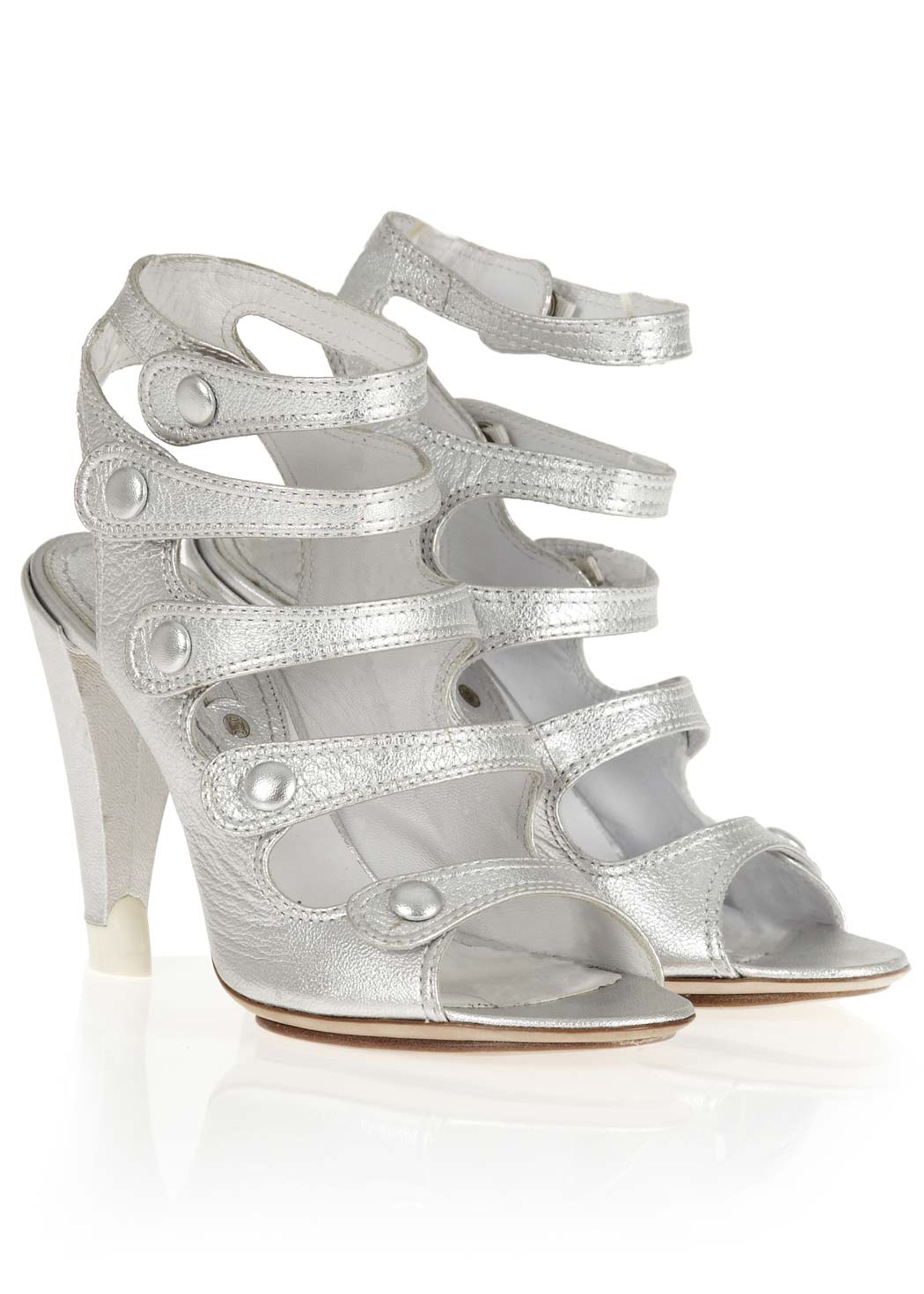 Supercoola stilettos i silver från det världsberömda märket Celine. Modellen är med hög klack, som har en speciell klack med vit plast. Stängs med tryckknappar vid de tre övre förslutningarna.