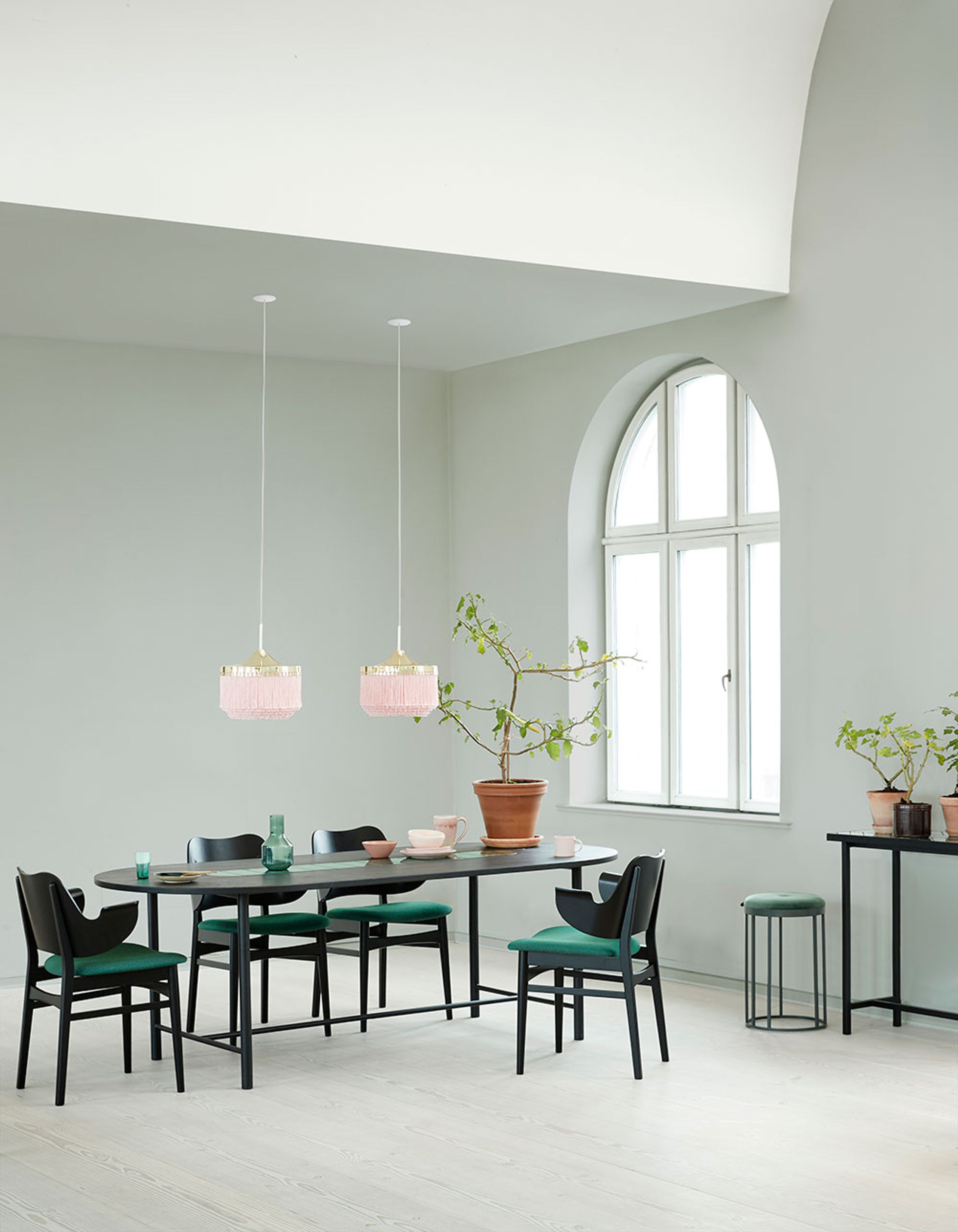 Be My Guest-serien, som designats av danska Charlotte Høncke, bygger på en enkel nordisk design som bygger på klassiska referenser i form av rundade kanter och en elegant ram. Bordets ram är tillverkad av lätt pulverlackerat stål som kontrasterar mot den tunga bordsskivan i ek. Mitt på bordsskivan är kompletterad med färgade kakelplattor, vilket ger bordet ett retro-modernt utseende som passar perfekt in i det nordiska hemmet.